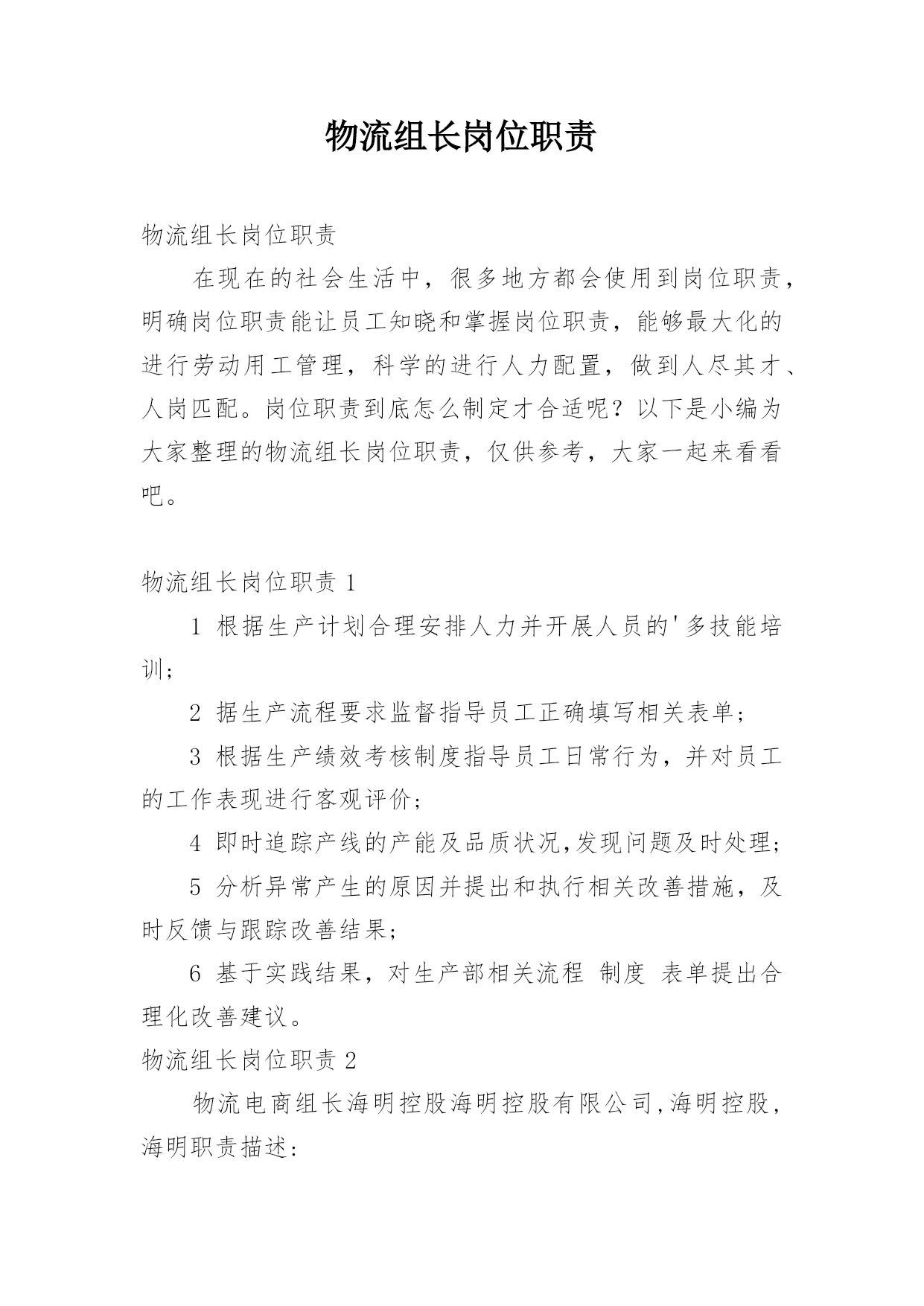 物流组长岗位职责物流组长岗位职责在现在的社会生活中,很多地方都会使用到岗位职责,明确岗位职责能让员工知晓和掌握岗位职责,能够最大化的进行劳动用工管理,科学的进行人力配置,做到人尽其才、人岗匹配。岗位职责到底怎么制定才合适呢?以下是小编为大家整理的物流组长岗位职责,仅供参考,大家一起来看看吧。物流组长岗位职责11根据生产计划合理安排人力并开展人员的'多技能培训;2据生产流程要求监督指导员工正确填写相关表单;3根据生产绩效考核制度指导员工日常行为,并对员工的工作表现进行客观评价;4即时追踪产线的产能及品质状况