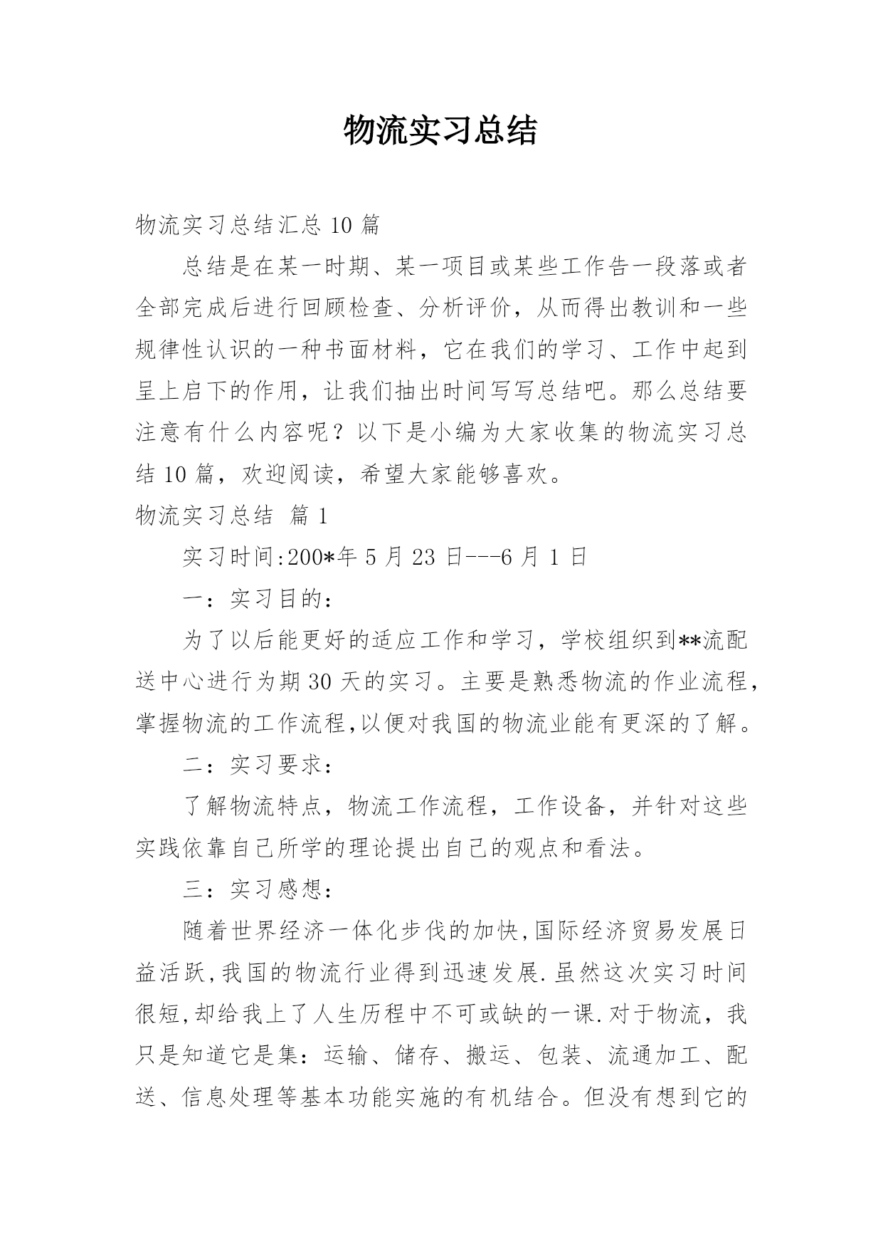 物流实习总结物流实习总结汇总10篇总结是在某一时期、某一项目或某些工作告一段落或者全部完成后进行回顾检查、分析评价,从而得出教训和一些规律性认识的一种书面材料,它在我们的学习、工作中起到呈上启下的作用,让我们抽出时间写写总结吧。那么总结要注意有什么内容呢?以下是小编为大家收集的物流实习总结10篇,欢迎阅读,希望大家能够喜欢。物流实习总结篇1实习时间:200*年5月23日---6月1日一:实习目的:为了以后能更好的适应工作和学习,学校组织到**流配送中心进行为期30天的实习。主要是熟悉物流的作业流程,掌握物
