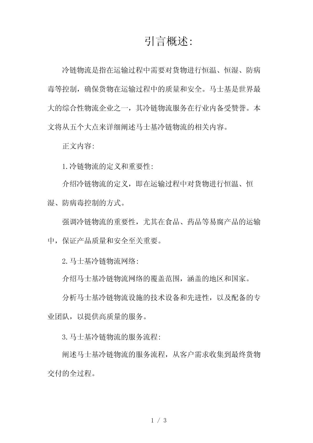 引言概述:冷链物流是指在运输过程中需要对货物进行恒温、恒湿、防病毒等控制,确保货物在运输过程中的质量和安全。马士基是世界最大的综合性物流企业之一,其冷链物流服务在行业内备受赞誉。本文将从五个大点来详细阐述马士基冷链物流的相关内容。正文内容:1.冷链物流的定义和重要性:介绍冷链物流的定义,即在运输过程中对货物进行恒温、恒湿、防病毒控制的方式。强调冷链物流的重要性,尤其在食品、药品等易腐产品的运输中,保证产品质量和安全至关重要。2.马士基冷链物流网络:介绍马士基冷链物流网络的覆盖范围,涵盖的地区和国家。分析马