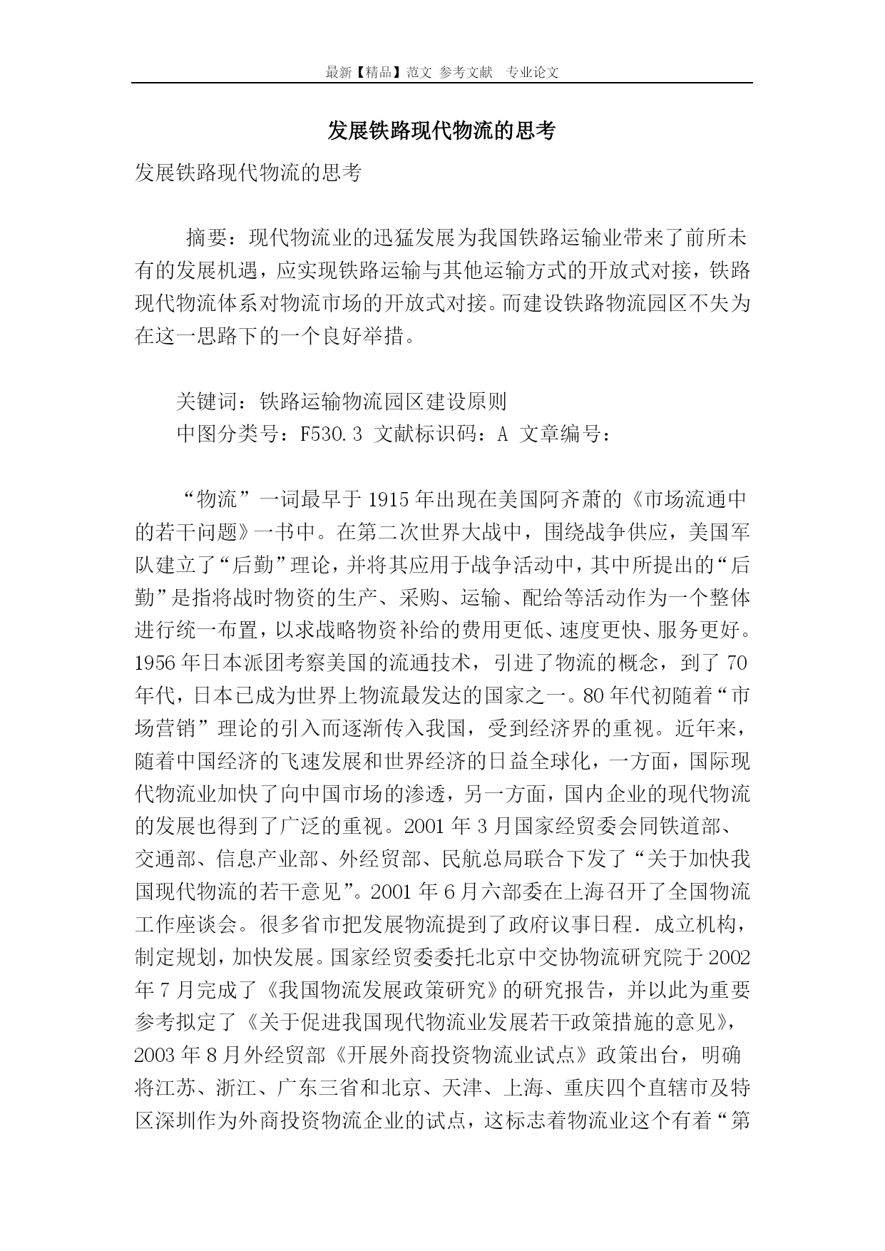 最新【精品】范文参考文献专业论文发展铁路现代物流的思考发展铁路现代物流的思考摘要:现代物流业的迅猛发展为我国铁路运输业带来了前所未有的发展机遇,应实现铁路运输与其他运输方式的开放式对接,铁路现代物流体系对物流市场的开放式对接。而建设铁路物流园区不失为在这一思路下的一个良好举措。关键词:铁路运输物流园区建设原则中图分类号:F530.3文献标识码:A文章编号:“物流”一词最早于1915年出现在美国阿齐萧的《市场流通中的若干问题》一书中。在第二次世界大战中,围绕战争供应,美国军队建立了“后勤”理论,并将其应用于