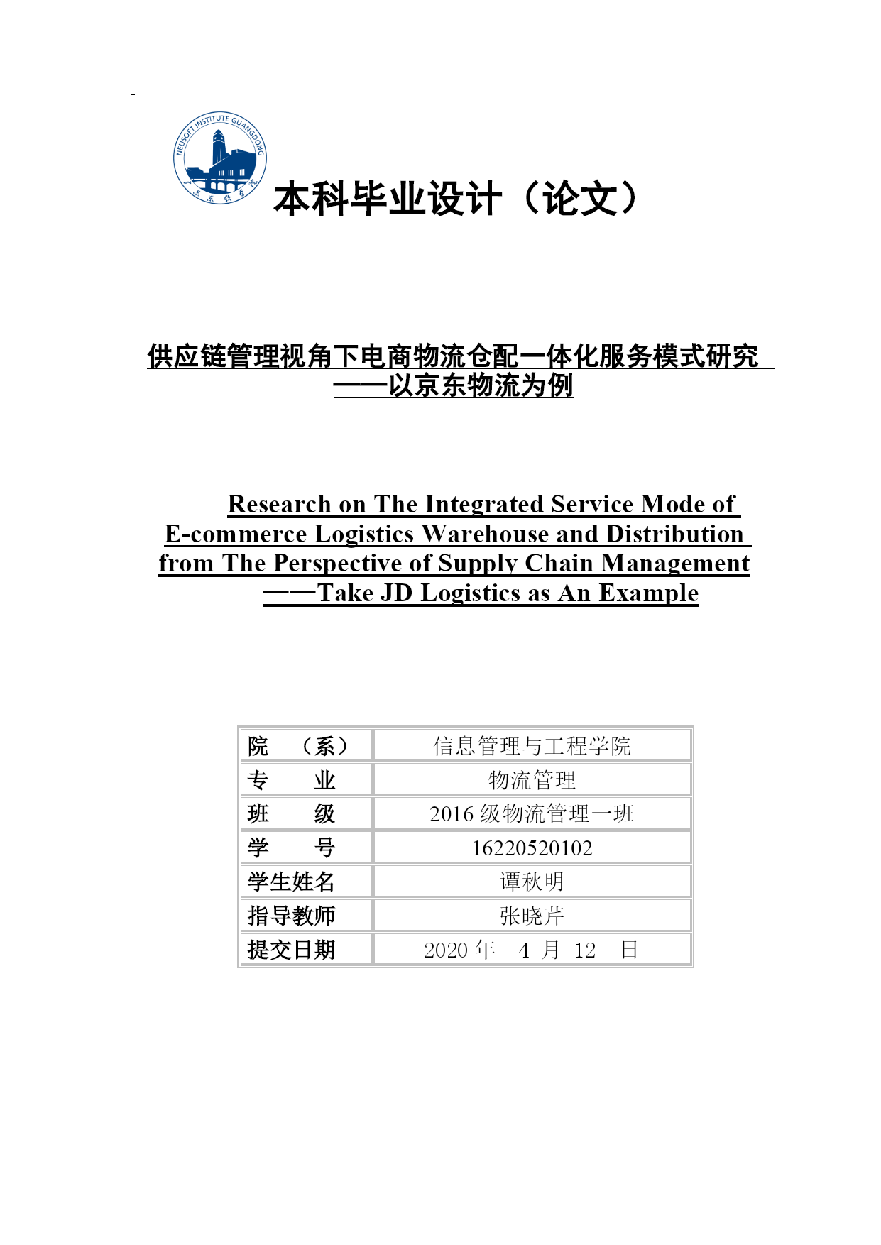 16220520102_谭秋明_供应链管理视角下电商物流仓配一体化服务模式研究——以京东物流为例 (1).docx