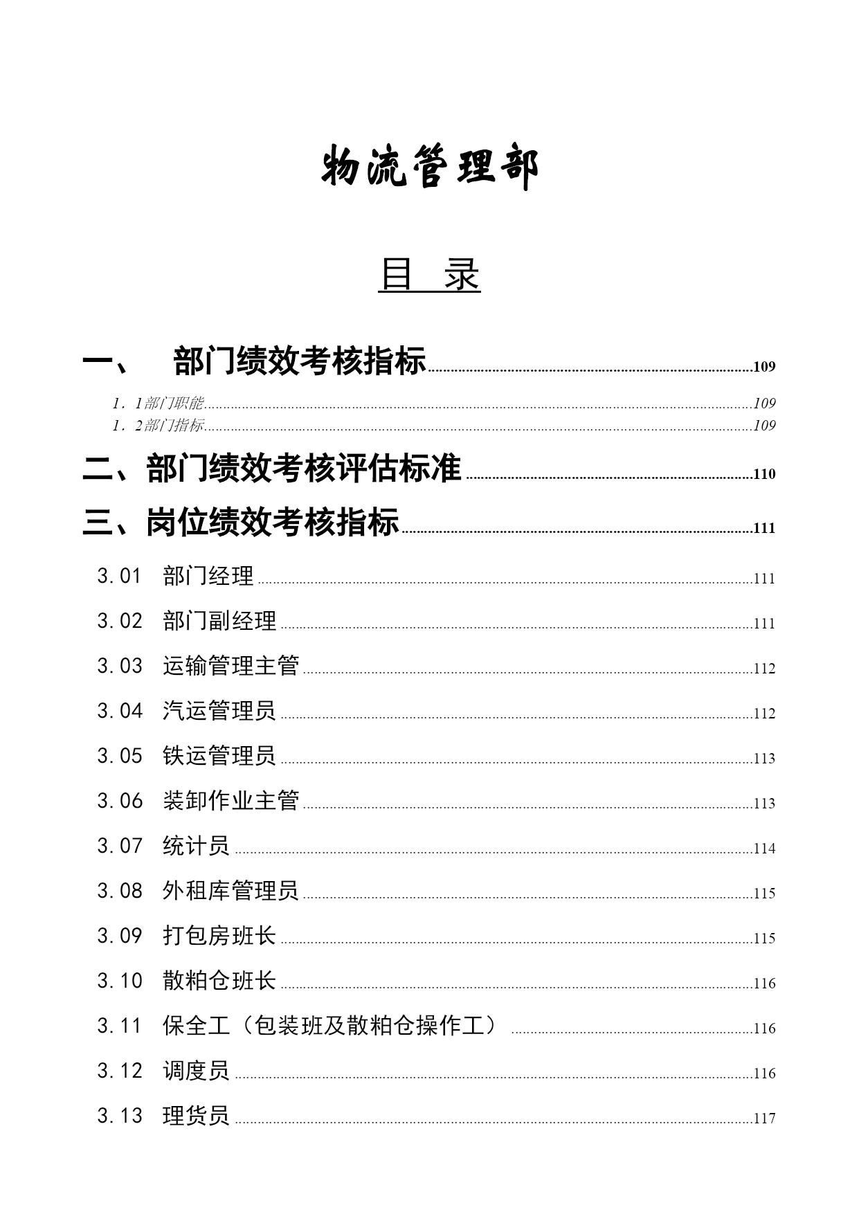 物流管理部目录TOC\o"1-3"\h\zHYPERLINK\l"_Toc103419342"一、部门绩效考核指标PAGEREF_Toc103419342\h109HYPERLINK\l"_Toc103419343"1.1部门职能PAGEREF_Toc103419343\h109HYPERLINK\l"_Toc103419344"1.2部门指标PAGEREF_Toc103419344\h109HYPERLINK\l"_Toc103419345"二、部门绩效考核评