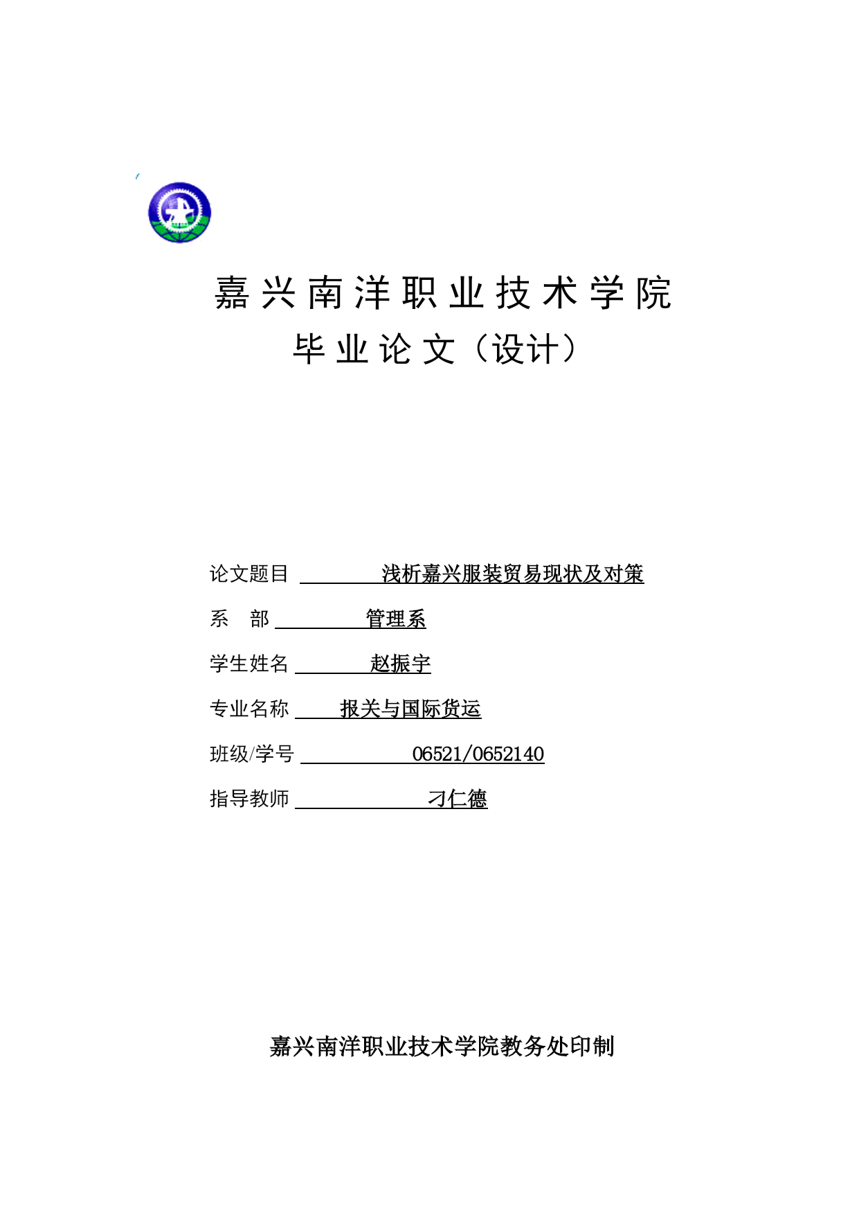 嘉兴南洋职业技术学院毕业论文(设计)论文题目浅析嘉兴服装贸易现状及对策系部管理系学生姓名赵振宇专业名称报关与国际货运班级/学号06521/0652140指导教师刁仁德嘉兴南洋职业技术学院教务处印制驰田汽车与第三方物流企业关系管理的应用研究【摘要】随着中国“入世”,经济一体化步伐加快,产品生命周期的日益缩短,企业间竞争更加激烈,企业对物流重要性的认识逐渐深化,视其为“第三利润源泉”,对专业化、多功能的第三方物流需求日渐增加。随着国内汽车行业竞争加剧,汽车制造企业纷纷将物流业务外包,集中精力发展主营业务,以提