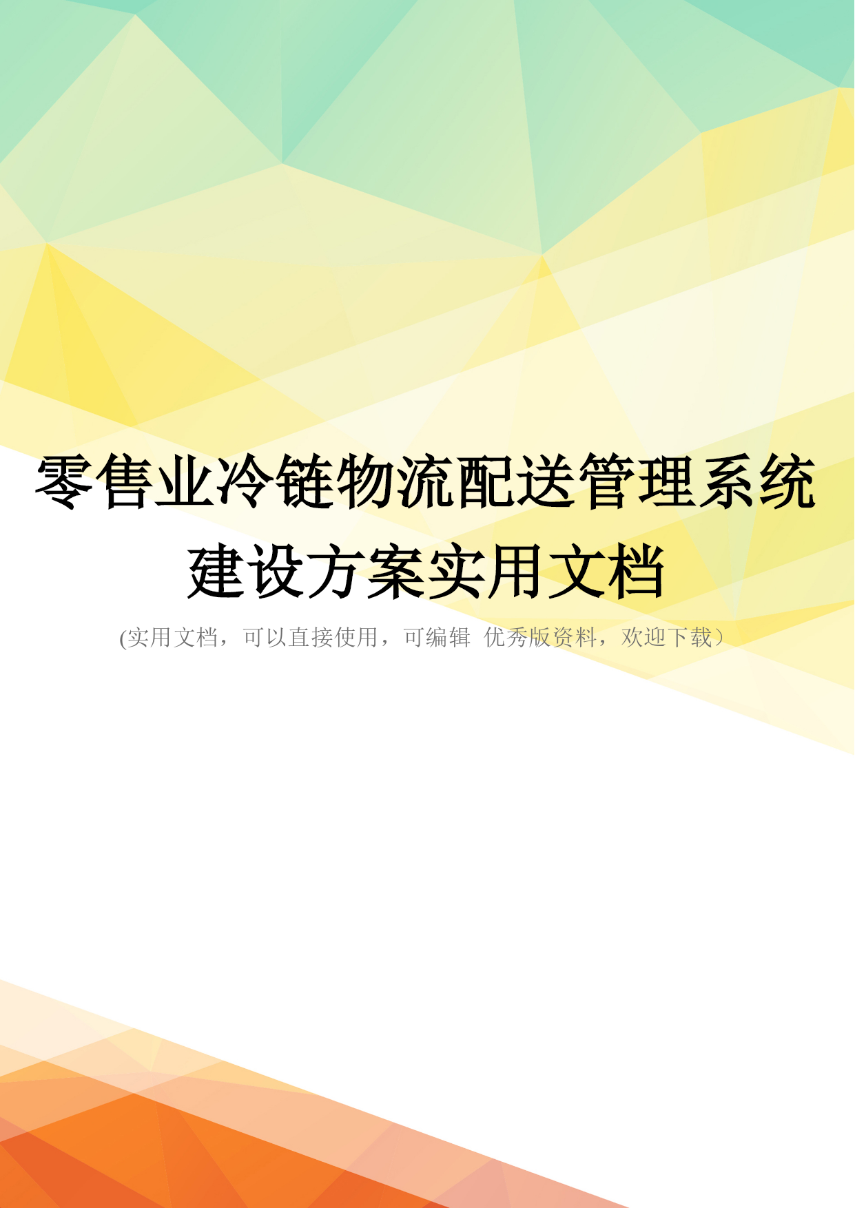 零售业冷链物流配送管理系统建设方案实用文档(实用文档,可以直接使用,可编辑优秀版资料,欢迎下载)零售业冷链物流配送管理系统建设方案二零一一年六月目录TOC\o"1-3"\h\z\uHYPERLINK\l"_Toc295909300”第1章项目概述PAGEREF_Toc295909300\h1HYPERLINK\l"_Toc295909301"第2章需求分析PAGEREF_Toc295909301\h1HYPERLINK\l"_Toc295909302"2。1用户需求分析P