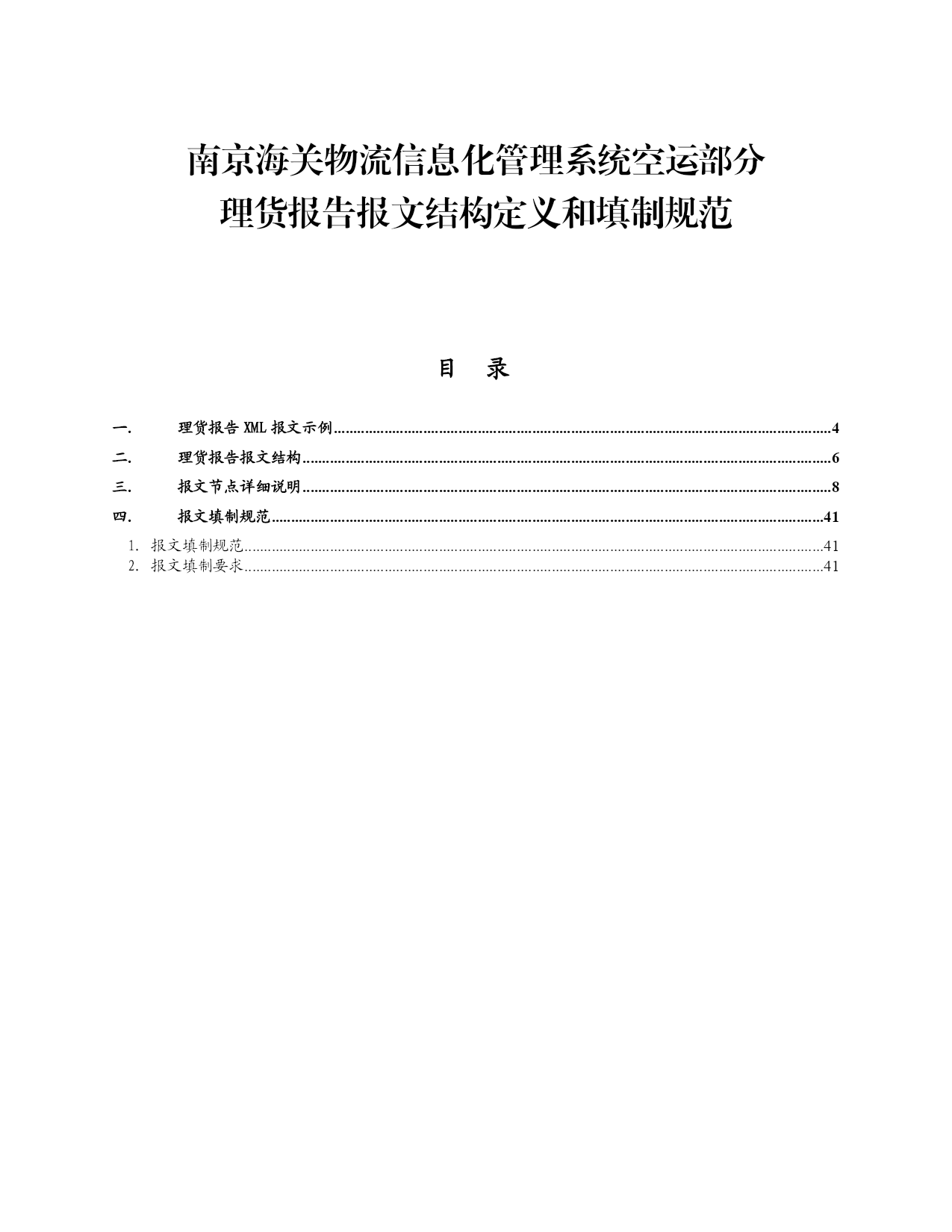 南京海关物流信息化管理系统空运部分理货报告报文结构定义和填制规范目录TOC\o"1-4"\h\z\uHYPERLINK\l"_Toc224653384"一.理货报告XML报文示例PAGEREF_Toc224653384\h4HYPERLINK\l"_Toc224653385"二.理货报告报文结构PAGEREF_Toc224653385\h6HYPERLINK\l"_Toc224653386"三.报文节点详细说明PAGEREF_Toc224653386\h8HYPE