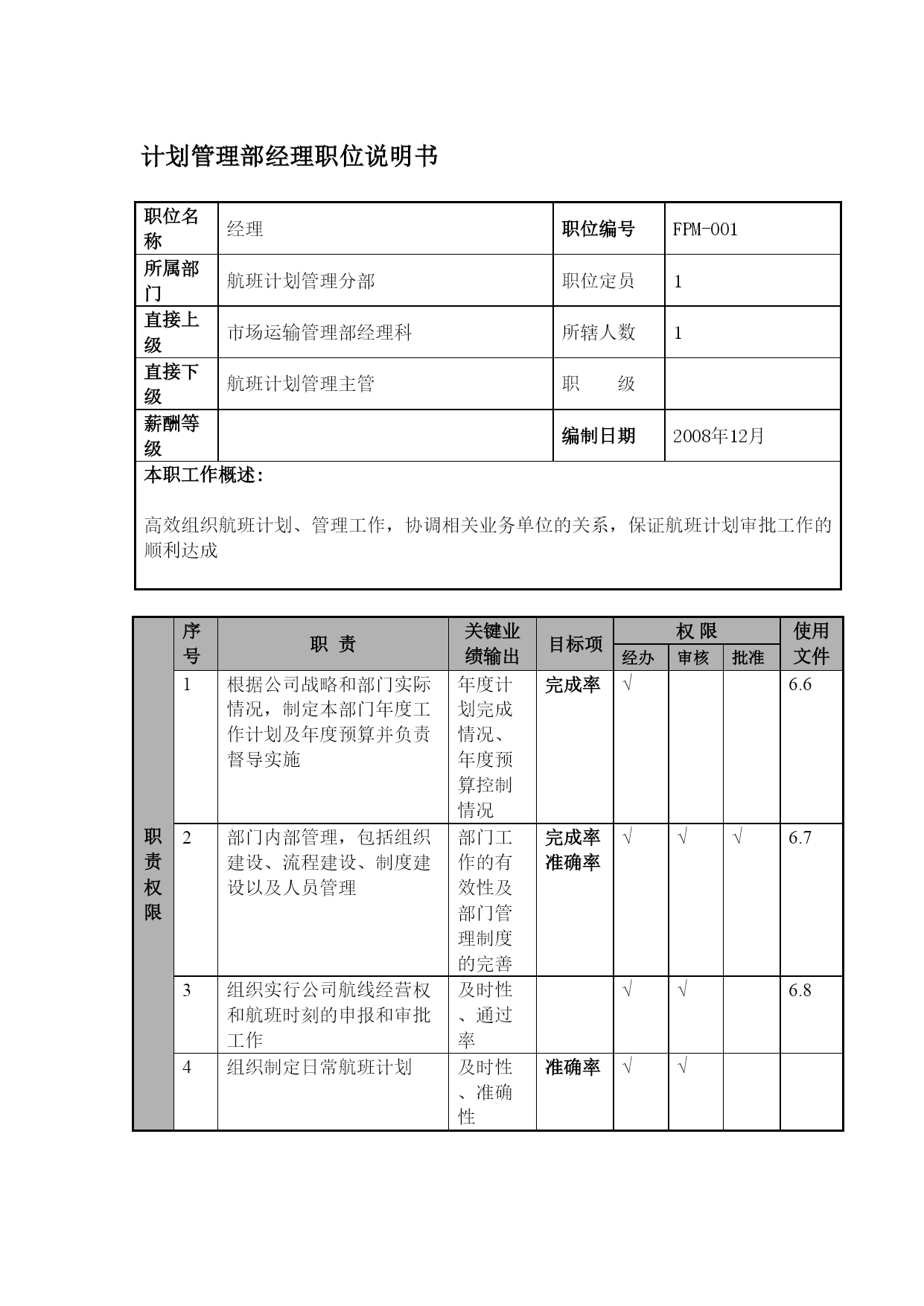 计划管理部经理职位说明书职位名称经理职位编号FPM-001所属部门航班计划管理分部职位定员1直接上级市场运输管理部经理科所辖人数1直接下级航班计划管理主管职级薪酬等级编制日期2008年12月本职工作概述:高效组织航班计划、管理工作,协调相关业务单位的关系,保证航班计划审批工作的顺利达成职责权限序号职责关键业绩输出目标项权限使用文件经办审核批准1根据公司战略和部门实际情况,制定本部门年度工作计划及年度预算并负责督导实施年度计划完成情况、年度预算控制情况完成率√6.62部门内部管理,包括组织建设、流程建设、制