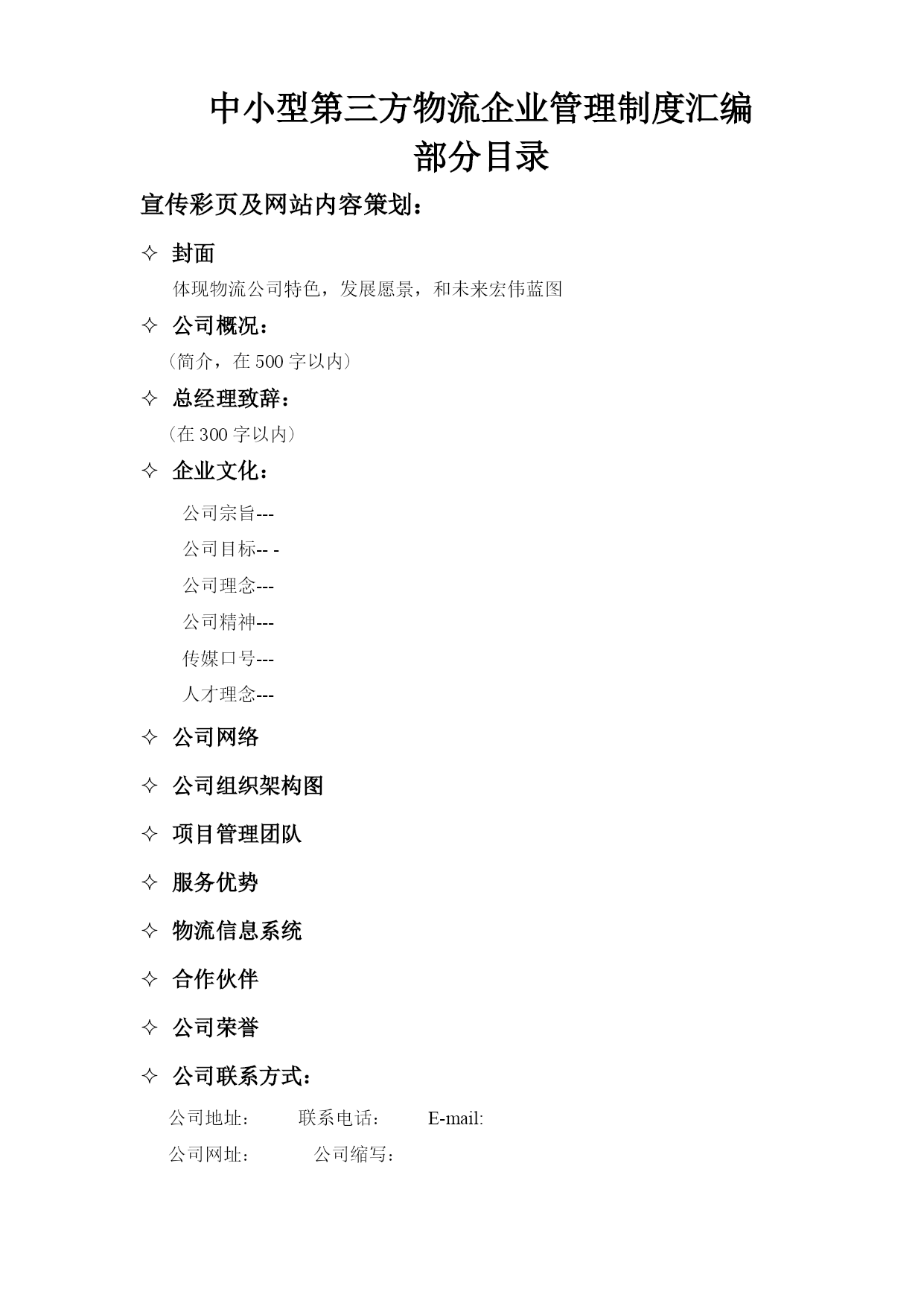 中小型第三方物流企业管理制度汇编部分目录宣传彩页及网站内容策划:封面体现物流公司特色,发展愿景,和未来宏伟蓝图公司概况:(简介,在500字以内)总经理致辞:(在300字以内)企业文化:公司宗旨---公司目标---公司理念---公司精神---传媒口号---人才理念---公司网络公司组织架构图项目管理团队服务优势物流信息系统合作伙伴公司荣誉公司联系方式:公司地址:联系电话:E-mail:公司网址:HYPERLINK"http://www.sswl.cn/"公司缩写:、行政(办公室)管理----第页公司基