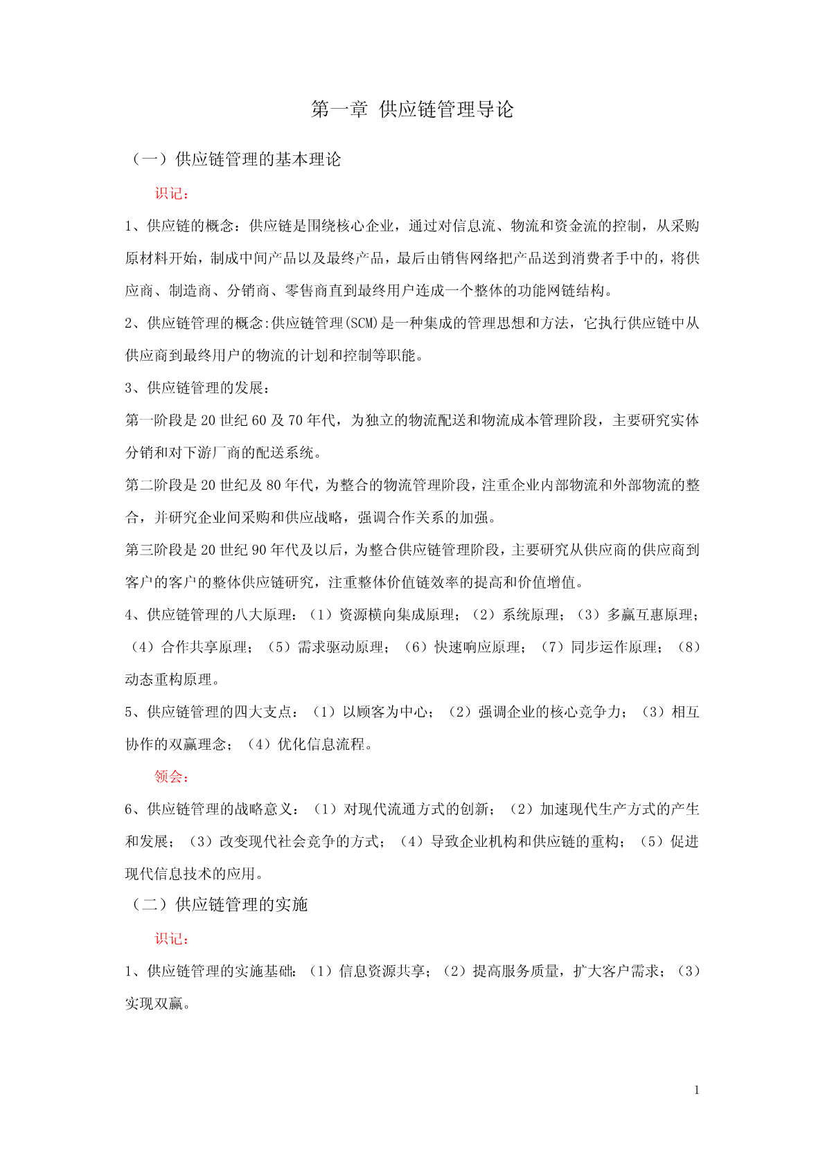 第一章供应链管理导论(一)供应链管理的基本理论识记:1、供应链的概念:供应链是围绕核心企业,通过对信息流、物流和资金流的控制,从采购原材料开始,制成中间产品以及最终产品,最后由销售网络把产品送到消费者手中的,将供应商、制造商、分销商、零售商直到最终用户连成一个整体的功能网链结构。2、供应链管理的概念:供应链管理(SCM)是一种集成的管理思想和方法,它执行供应链中从供应商到最终用户的物流的计划和控制等职能。3、供应链管理的发展:第一阶段是20世纪60及70年代,为独立的物流配送和物流成本管理阶段,主要研究实