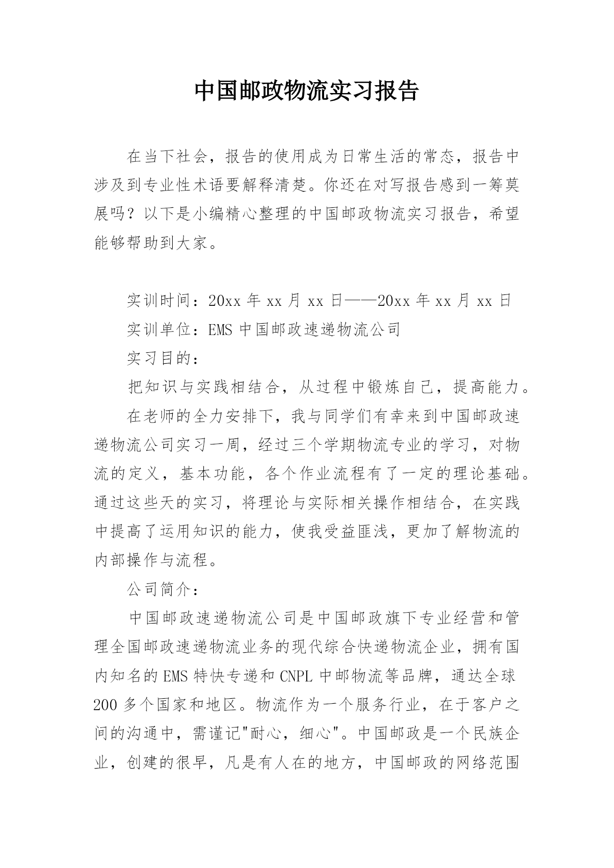 中国邮政物流实习报告在当下社会,报告的使用成为日常生活的常态,报告中涉及到专业性术语要解释清楚。你还在对写报告感到一筹莫展吗?以下是小编精心整理的中国邮政物流实习报告,希望能够帮助到大家。实训时间:20xx年xx月xx日——20xx年xx月xx日实训单位:EMS中国邮政速递物流公司实习目的:把知识与实践相结合,从过程中锻炼自己,提高能力。在老师的全力安排下,我与同学们有幸来到中国邮政速递物流公司实习一周,经过三个学期物流专业的学习,对物流的定义,基本功能,各个作业流程有了一定的理论基础。通过这些天的实习,