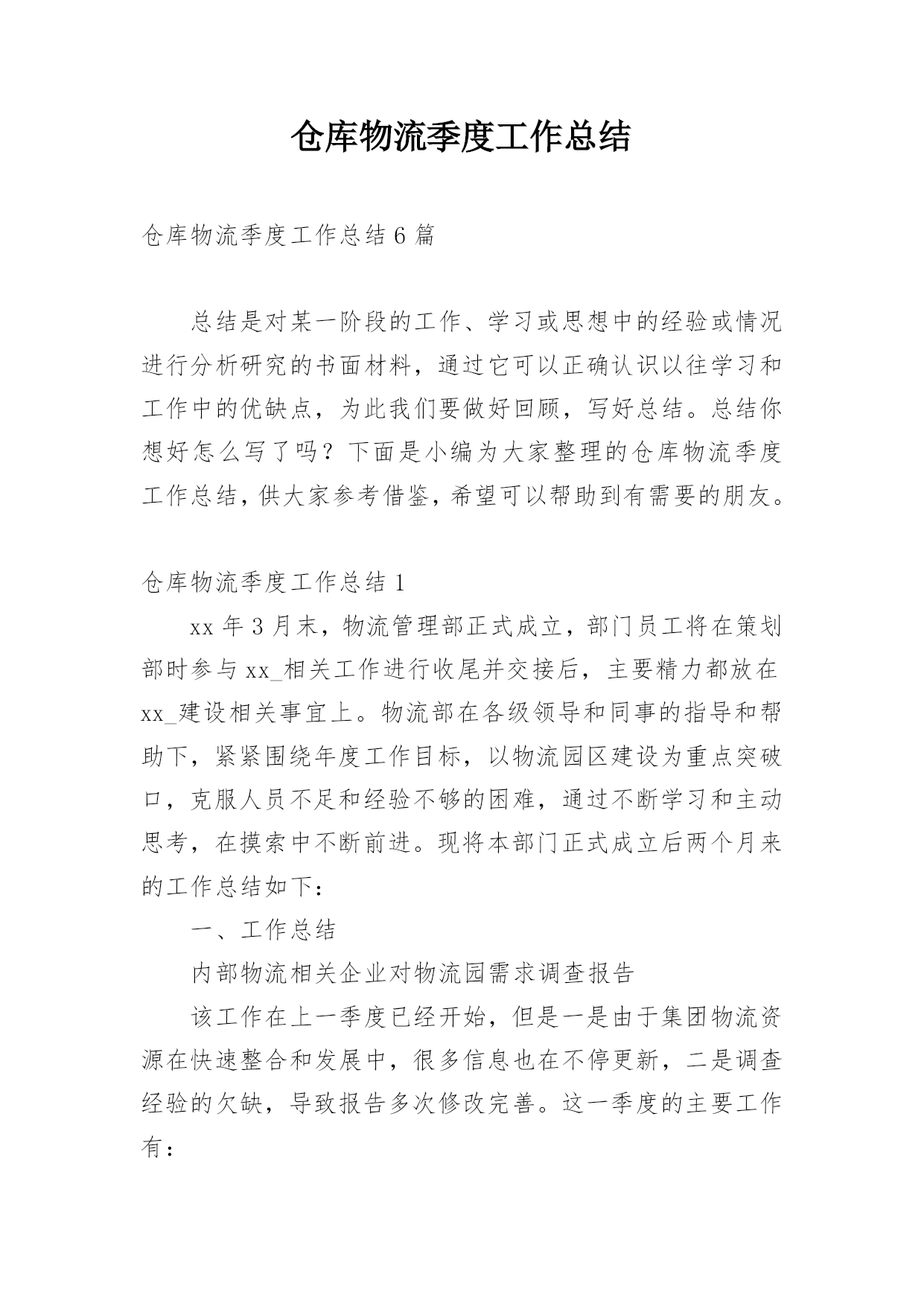仓库物流季度工作总结仓库物流季度工作总结6篇总结是对某一阶段的工作、学习或思想中的经验或情况进行分析研究的书面材料,通过它可以正确认识以往学习和工作中的优缺点,为此我们要做好回顾,写好总结。总结你想好怎么写了吗?下面是小编为大家整理的仓库物流季度工作总结,供大家参考借鉴,希望可以帮助到有需要的朋友。仓库物流季度工作总结1xx年3月末,物流管理部正式成立,部门员工将在策划部时参与xx_相关工作进行收尾并交接后,主要精力都放在xx_建设相关事宜上。物流部在各级领导和同事的指导和帮助下,紧紧围绕年度工作目标,以