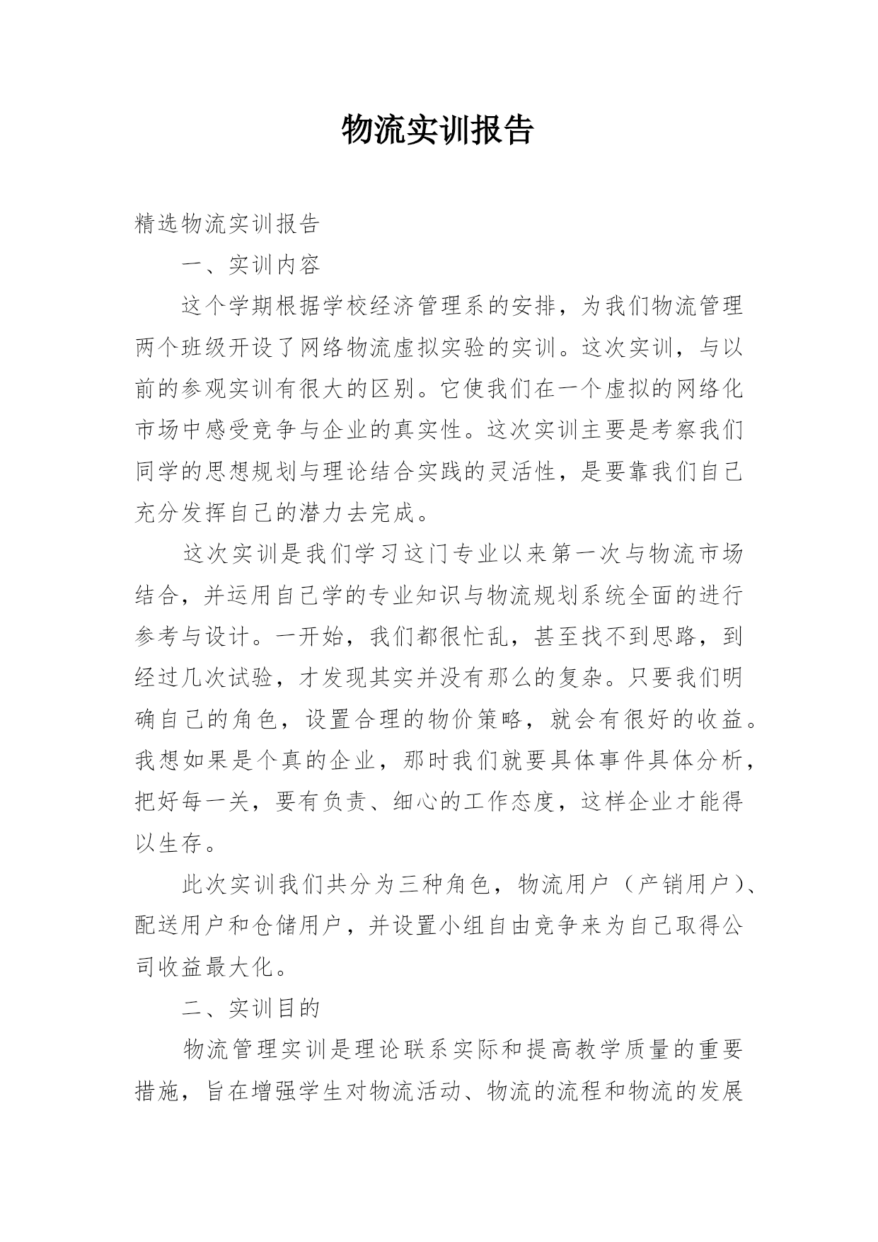 物流实训报告精选物流实训报告一、实训内容这个学期根据学校经济管理系的安排,为我们物流管理两个班级开设了网络物流虚拟实验的实训。这次实训,与以前的参观实训有很大的区别。它使我们在一个虚拟的网络化市场中感受竞争与企业的真实性。这次实训主要是考察我们同学的思想规划与理论结合实践的灵活性,是要靠我们自己充分发挥自己的潜力去完成。这次实训是我们学习这门专业以来第一次与物流市场结合,并运用自己学的专业知识与物流规划系统全面的进行参考与设计。一开始,我们都很忙乱,甚至找不到思路,到经过几次试验,才发现其实并没有那么的复