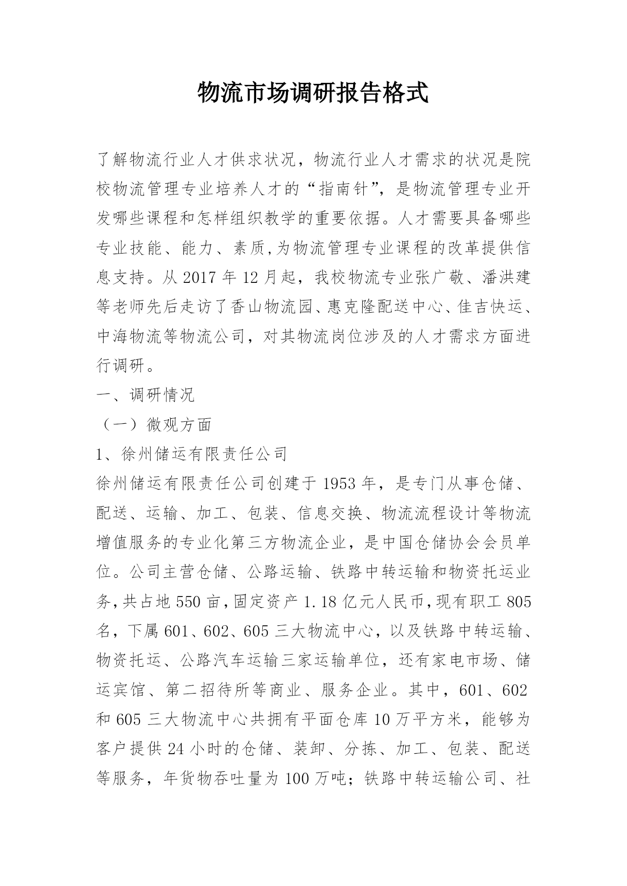 物流市场调研报告格式了解物流行业人才供求状况,物流行业人才需求的状况是院校物流管理专业培养人才的“指南针”,是物流管理专业开发哪些课程和怎样组织教学的重要依据。人才需要具备哪些专业技能、能力、素质,为物流管理专业课程的改革提供信息支持。从2017年12月起,我校物流专业张广敬、潘洪建等老师先后走访了香山物流园、惠克隆配送中心、佳吉快运、中海物流等物流公司,对其物流岗位涉及的人才需求方面进行调研。一、调研情况(一)微观方面1、徐州储运有限责任公司徐州储运有限责任公司创建于1953年,是专门从事仓储、配送、运