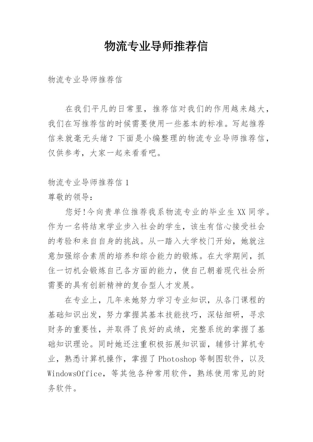 物流专业导师推荐信物流专业导师推荐信在我们平凡的日常里,推荐信对我们的作用越来越大,我们在写推荐信的时候需要使用一些基本的标准。写起推荐信来就毫无头绪?下面是小编整理的物流专业导师推荐信,仅供参考,大家一起来看看吧。物流专业导师推荐信1尊敬的领导:您好!今向贵单位推荐我系物流专业的毕业生XX同学。作为一名将结束学业步入社会的学生,该生有信心接受社会的考验和来自自身的挑战。从一踏入大学校门开始,她就注意加强综合素质的培养和综合能力的锻炼。在大学期间,抓住一切机会锻炼自己各方面的能力,使自己朝着现代社会所需要