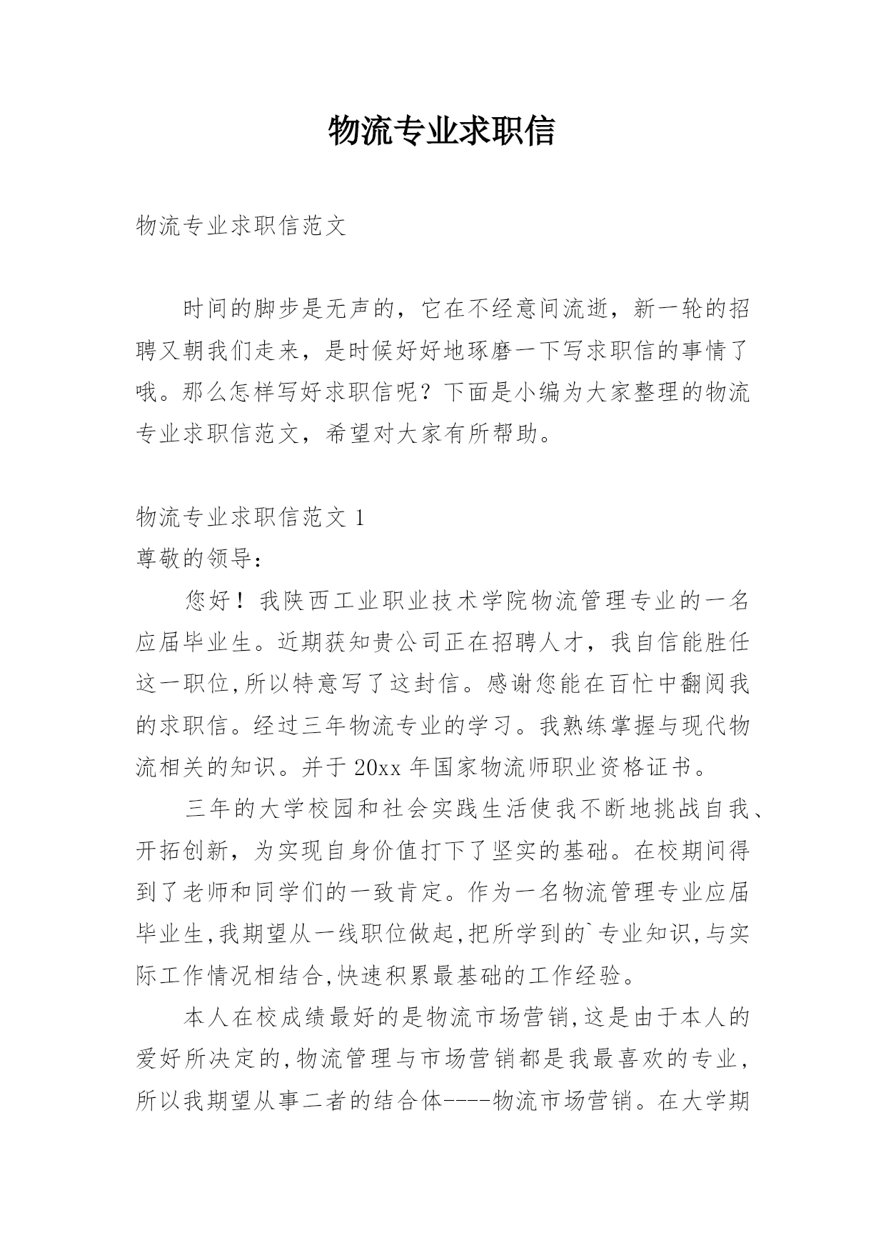 物流专业求职信物流专业求职信范文时间的脚步是无声的,它在不经意间流逝,新一轮的招聘又朝我们走来,是时候好好地琢磨一下写求职信的事情了哦。那么怎样写好求职信呢?下面是小编为大家整理的物流专业求职信范文,希望对大家有所帮助。物流专业求职信范文1尊敬的领导:您好!我陕西工业职业技术学院物流管理专业的一名应届毕业生。近期获知贵公司正在招聘人才,我自信能胜任这一职位,所以特意写了这封信。感谢您能在百忙中翻阅我的求职信。经过三年物流专业的学习。我熟练掌握与现代物流相关的知识。并于20xx年国家物流师职业资格证书。三年