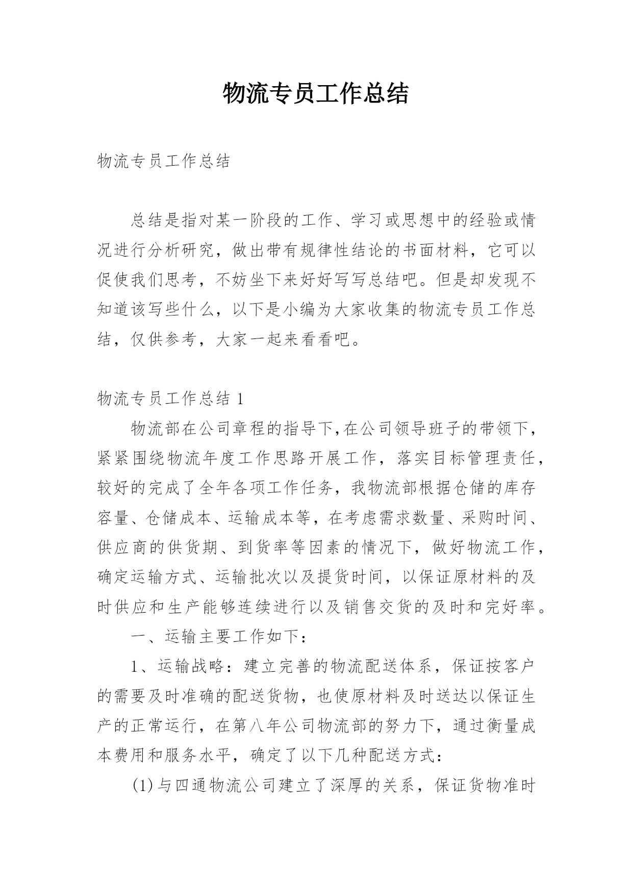 物流专员工作总结物流专员工作总结总结是指对某一阶段的工作、学习或思想中的经验或情况进行分析研究,做出带有规律性结论的书面材料,它可以促使我们思考,不妨坐下来好好写写总结吧。但是却发现不知道该写些什么,以下是小编为大家收集的物流专员工作总结,仅供参考,大家一起来看看吧。物流专员工作总结1物流部在公司章程的指导下,在公司领导班子的带领下,紧紧围绕物流年度工作思路开展工作,落实目标管理责任,较好的完成了全年各项工作任务,我物流部根据仓储的库存容量、仓储成本、运输成本等,在考虑需求数量、采购时间、供应商的供货期、