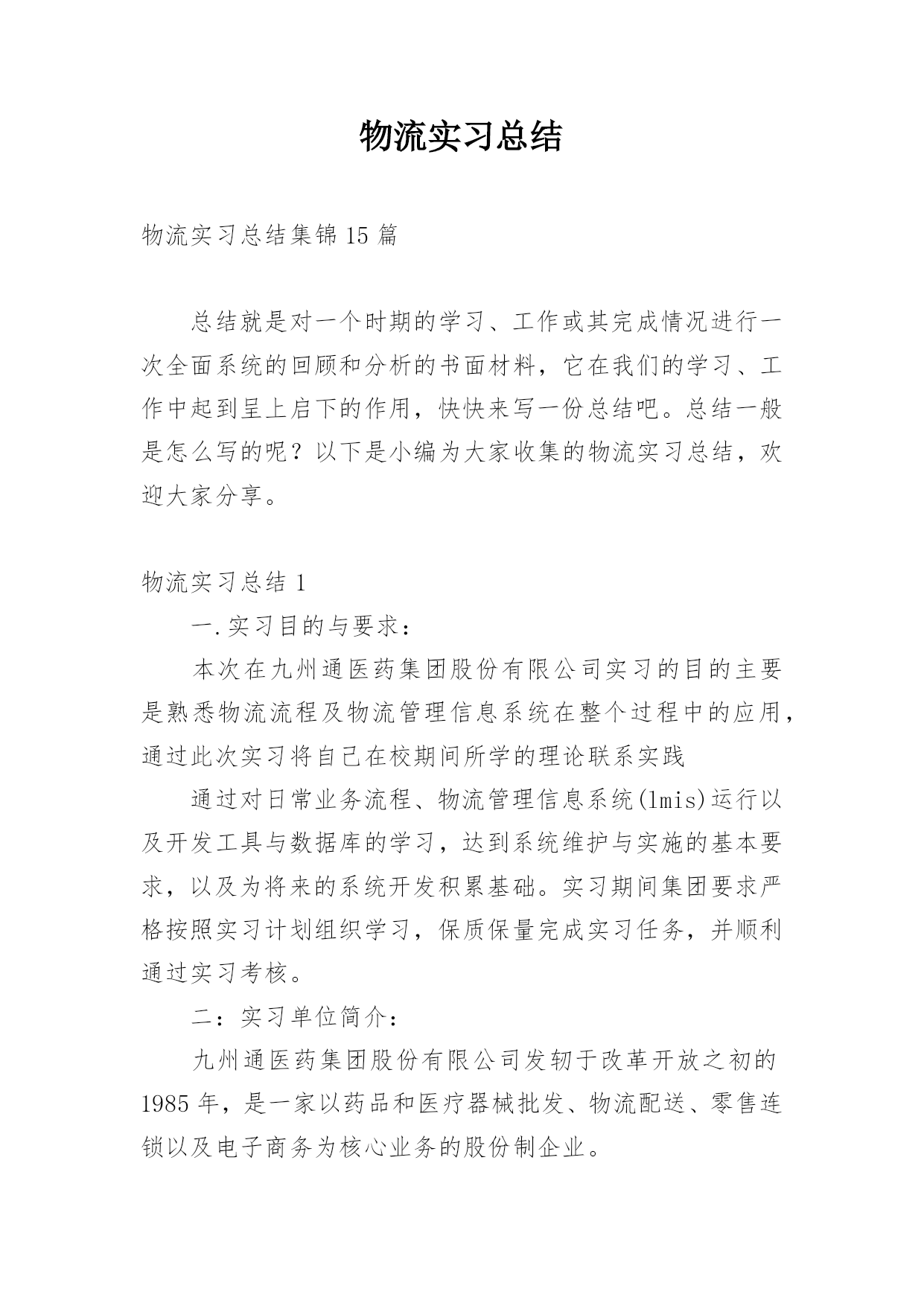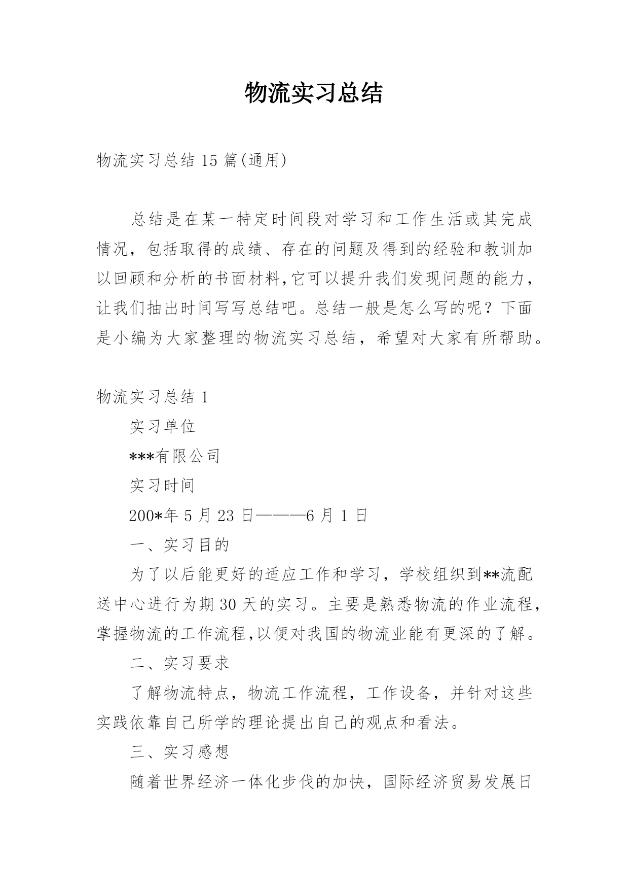 物流实习总结物流实习总结15篇(通用)总结是在某一特定时间段对学习和工作生活或其完成情况,包括取得的成绩、存在的问题及得到的经验和教训加以回顾和分析的书面材料,它可以提升我们发现问题的能力,让我们抽出时间写写总结吧。总结一般是怎么写的呢?下面是小编为大家整理的物流实习总结,希望对大家有所帮助。物流实习总结1实习单位***有限公司实习时间200*年5月23日———6月1日一、实习目的为了以后能更好的适应工作和学习,学校组织到**流配送中心进行为期30天的实习。主要是熟悉物流的作业流程,掌握物流的工作流程,以