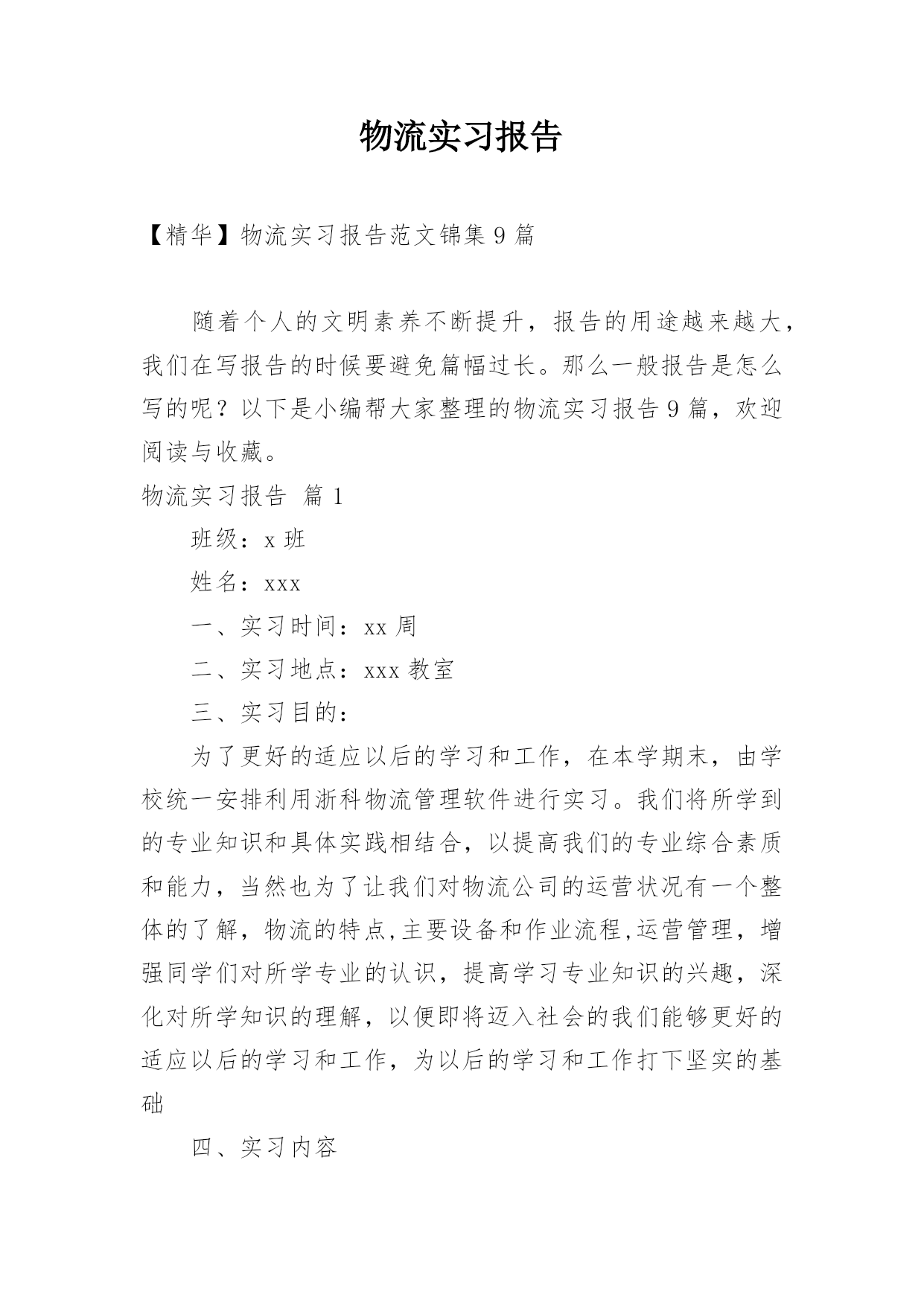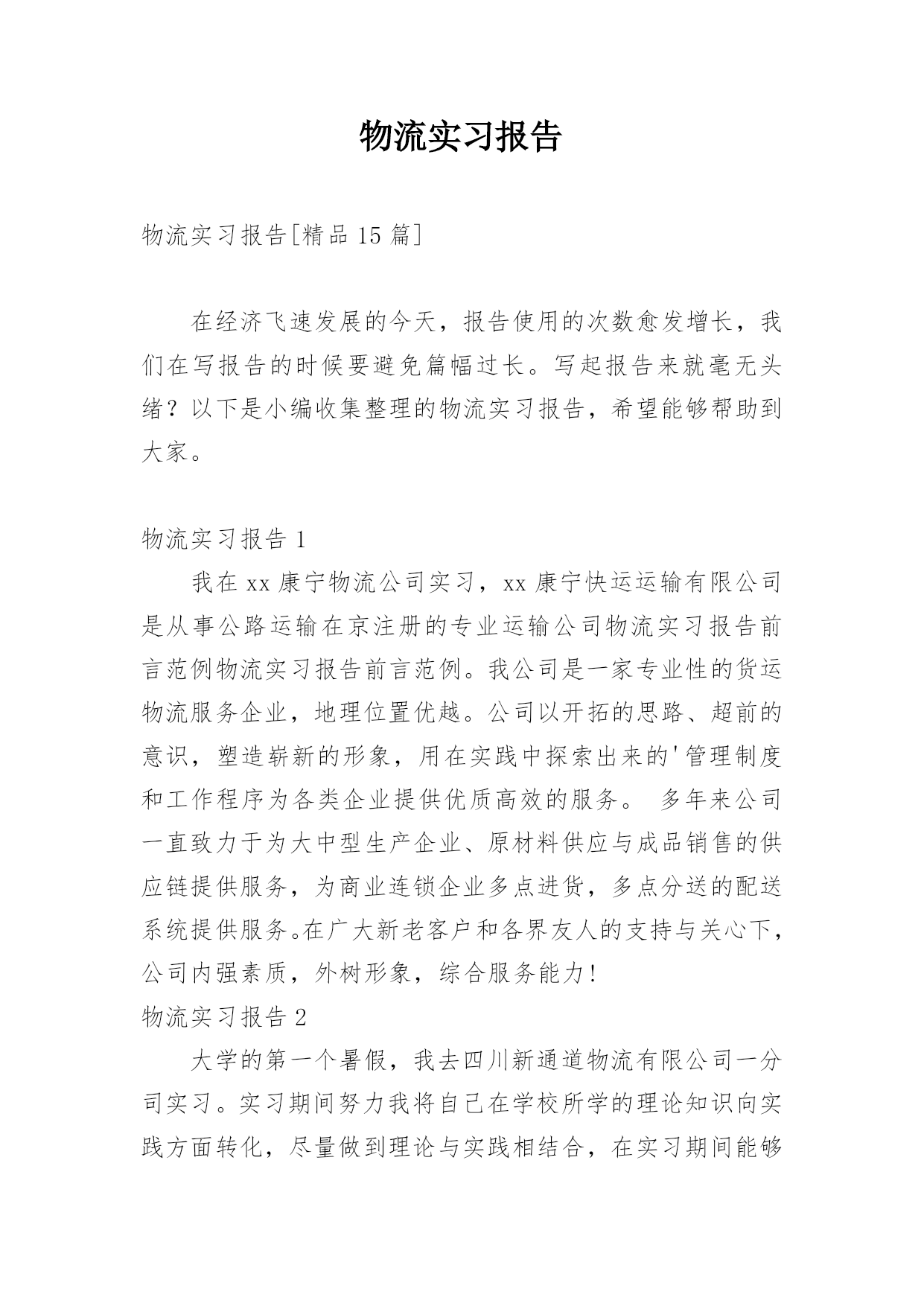 物流实习报告物流实习报告[精品15篇]在经济飞速发展的今天,报告使用的次数愈发增长,我们在写报告的时候要避免篇幅过长。写起报告来就毫无头绪?以下是小编收集整理的物流实习报告,希望能够帮助到大家。物流实习报告1我在xx康宁物流公司实习,xx康宁快运运输有限公司是从事公路运输在京注册的专业运输公司物流实习报告前言范例物流实习报告前言范例。我公司是一家专业性的货运物流服务企业,地理位置优越。公司以开拓的思路、超前的意识,塑造崭新的形象,用在实践中探索出来的'管理制度和工作程序为各类企业提供优质高效的服务。多年来