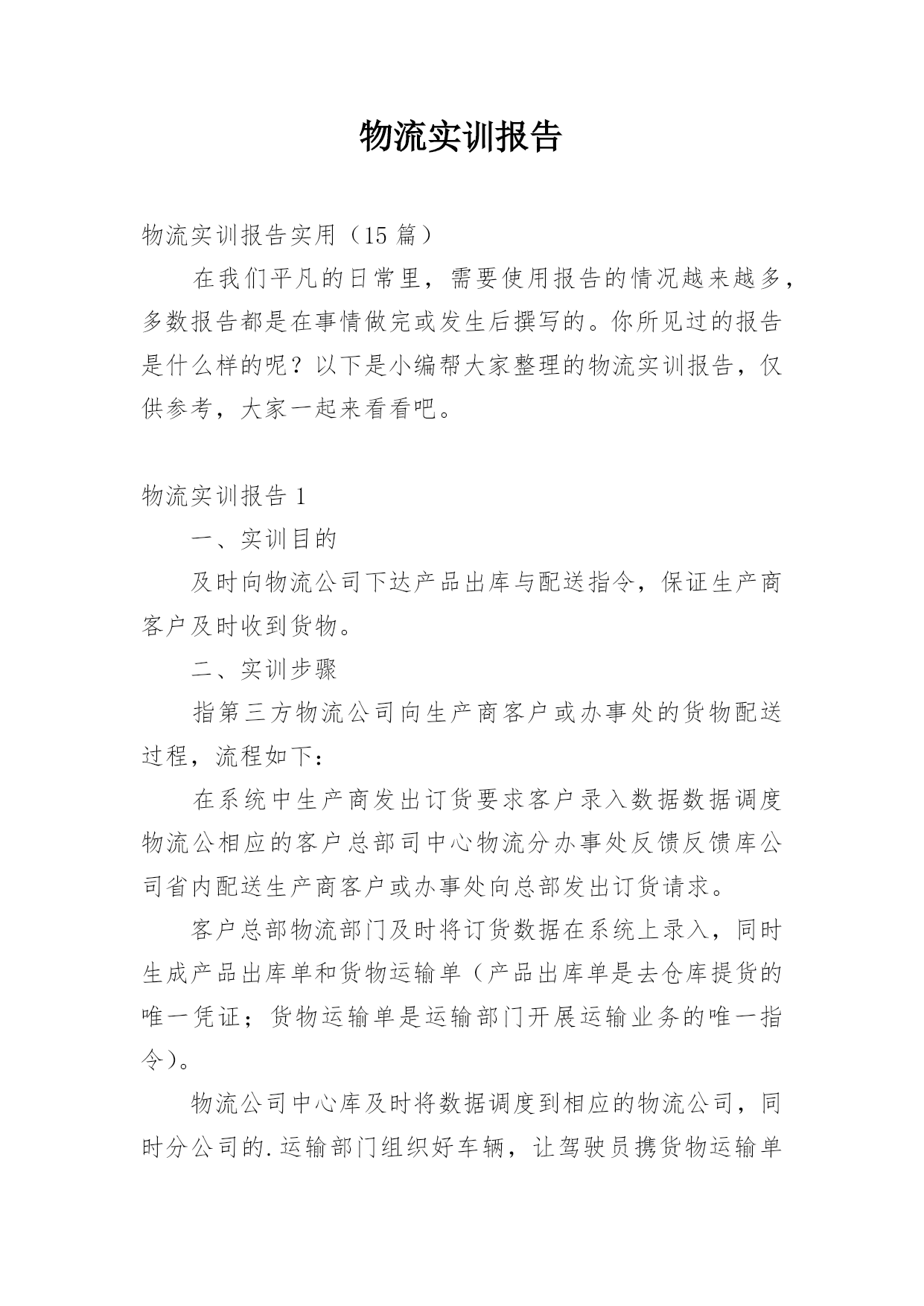 物流实训报告物流实训报告实用(15篇)在我们平凡的日常里,需要使用报告的情况越来越多,多数报告都是在事情做完或发生后撰写的。你所见过的报告是什么样的呢?以下是小编帮大家整理的物流实训报告,仅供参考,大家一起来看看吧。物流实训报告1一、实训目的及时向物流公司下达产品出库与配送指令,保证生产商客户及时收到货物。二、实训步骤指第三方物流公司向生产商客户或办事处的货物配送过程,流程如下:在系统中生产商发出订货要求客户录入数据数据调度物流公相应的客户总部司中心物流分办事处反馈反馈库公司省内配送生产商客户或办事处向总