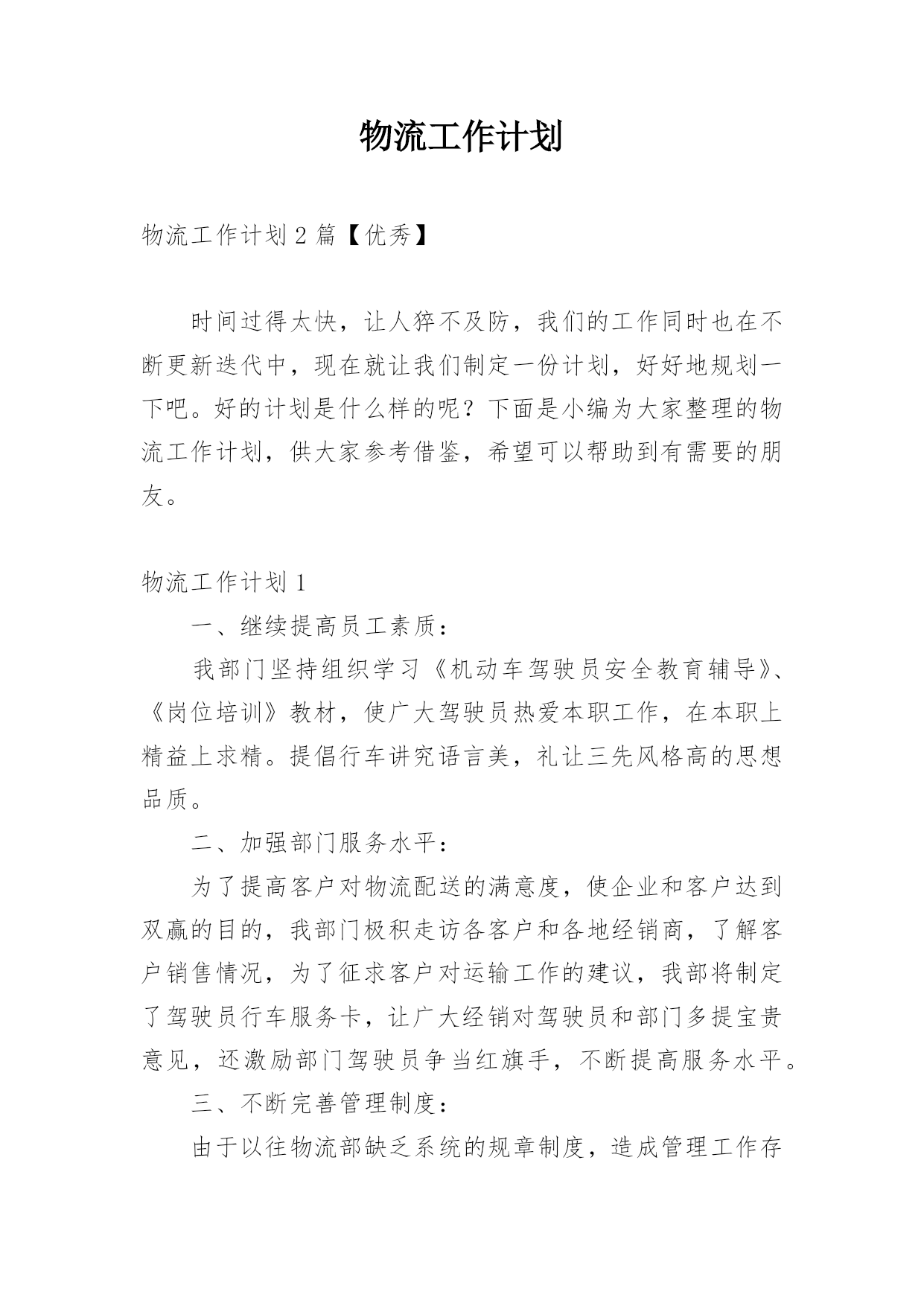 物流工作计划物流工作计划2篇【优秀】时间过得太快,让人猝不及防,我们的工作同时也在不断更新迭代中,现在就让我们制定一份计划,好好地规划一下吧。好的计划是什么样的呢?下面是小编为大家整理的物流工作计划,供大家参考借鉴,希望可以帮助到有需要的朋友。物流工作计划1一、继续提高员工素质:我部门坚持组织学习《机动车驾驶员安全教育辅导》、《岗位培训》教材,使广大驾驶员热爱本职工作,在本职上精益上求精。提倡行车讲究语言美,礼让三先风格高的思想品质。二、加强部门服务水平:为了提高客户对物流配送的满意度,使企业和客户达到双