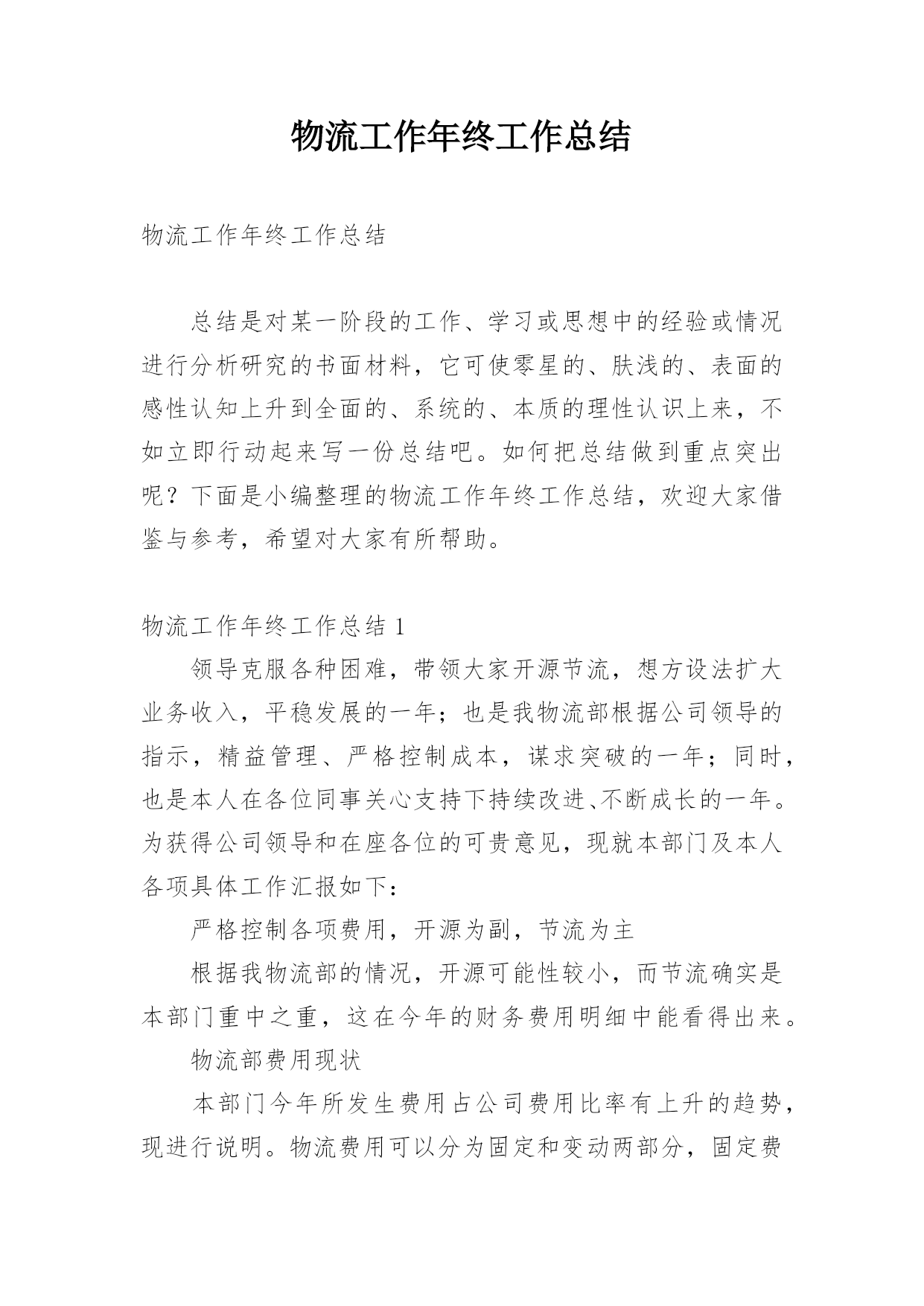 物流工作年终工作总结物流工作年终工作总结总结是对某一阶段的工作、学习或思想中的经验或情况进行分析研究的书面材料,它可使零星的、肤浅的、表面的感性认知上升到全面的、系统的、本质的理性认识上来,不如立即行动起来写一份总结吧。如何把总结做到重点突出呢?下面是小编整理的物流工作年终工作总结,欢迎大家借鉴与参考,希望对大家有所帮助。物流工作年终工作总结1领导克服各种困难,带领大家开源节流,想方设法扩大业务收入,平稳发展的一年;也是我物流部根据公司领导的指示,精益管理、严格控制成本,谋求突破的一年;同时,也是本人在各