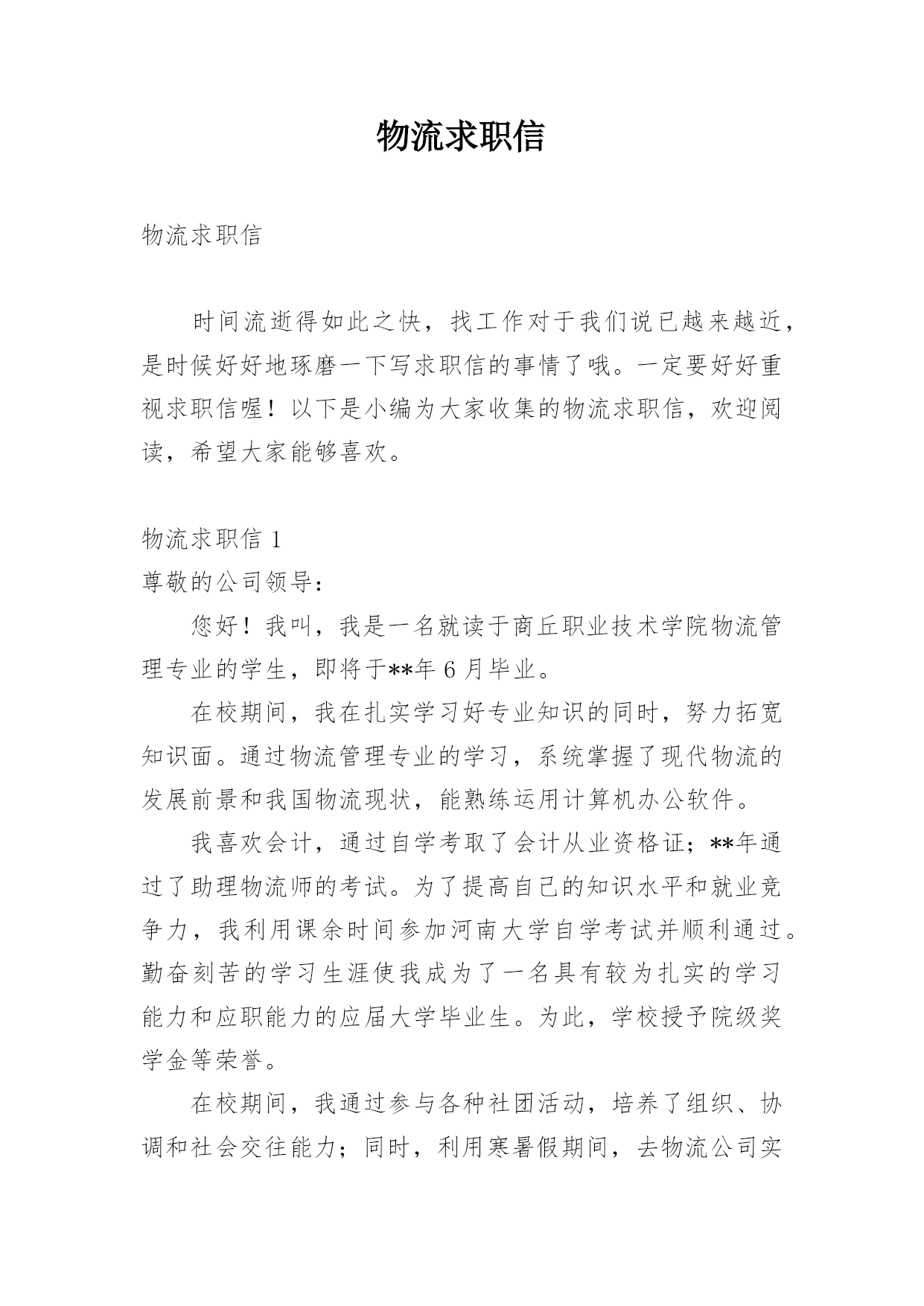 物流求职信物流求职信时间流逝得如此之快,找工作对于我们说已越来越近,是时候好好地琢磨一下写求职信的事情了哦。一定要好好重视求职信喔!以下是小编为大家收集的物流求职信,欢迎阅读,希望大家能够喜欢。物流求职信1尊敬的公司领导:您好!我叫,我是一名就读于商丘职业技术学院物流管理专业的学生,即将于**年6月毕业。在校期间,我在扎实学习好专业知识的同时,努力拓宽知识面。通过物流管理专业的学习,系统掌握了现代物流的发展前景和我国物流现状,能熟练运用计算机办公软件。我喜欢会计,通过自学考取了会计从业资格证;**年通过了