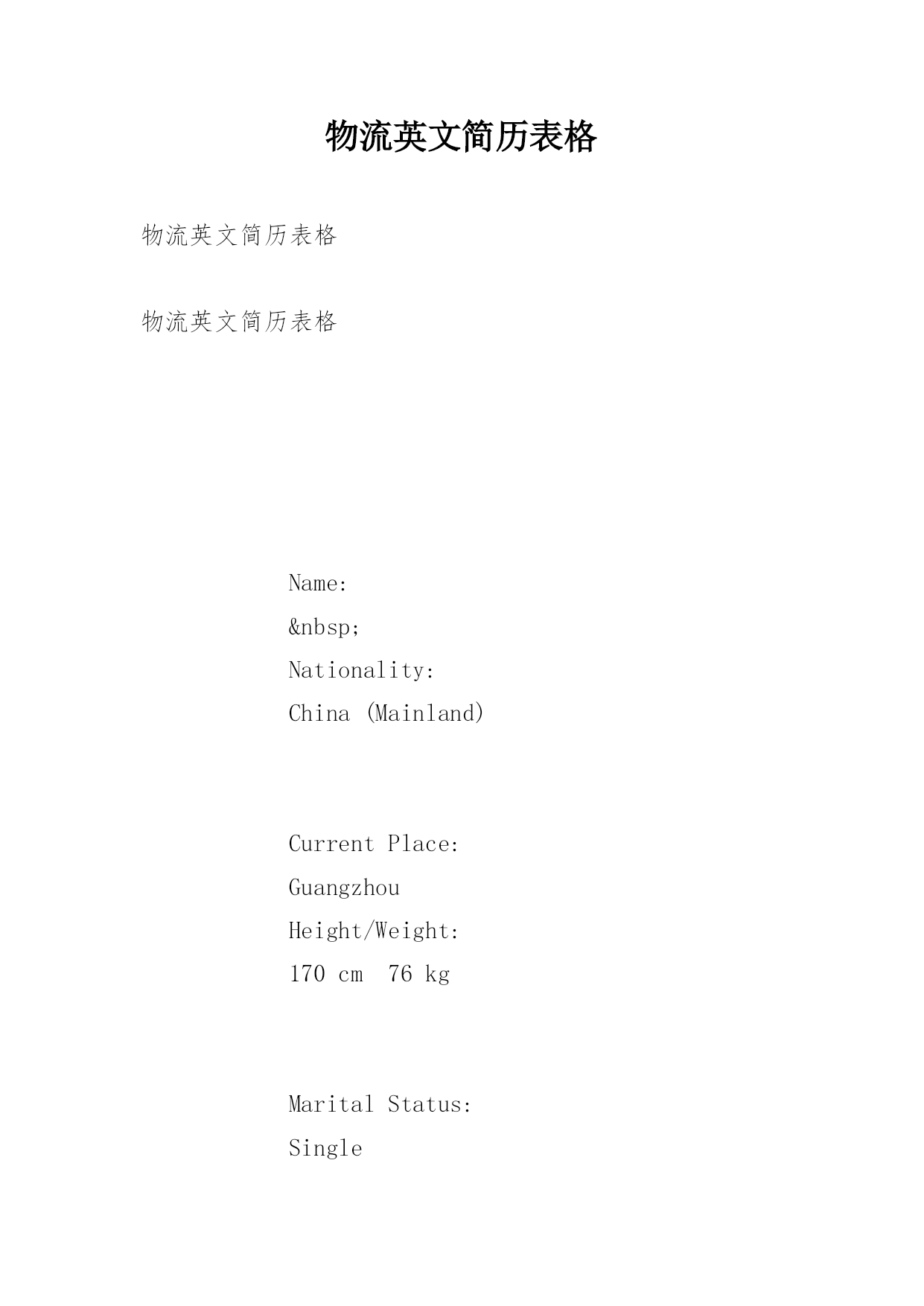 物流英文简历表格物流英文简历表格物流英文简历表格Name: Nationality:China(Mainland)CurrentPlace:GuangzhouHeight/Weight:170cm76kgMaritalStatus:SingleAge:32yearsCareerObjectiveApplicationtype:JobseekerPreferredjobtitle:Purchasingmanager/supervisor:PurchasingSupervisor、others:、o