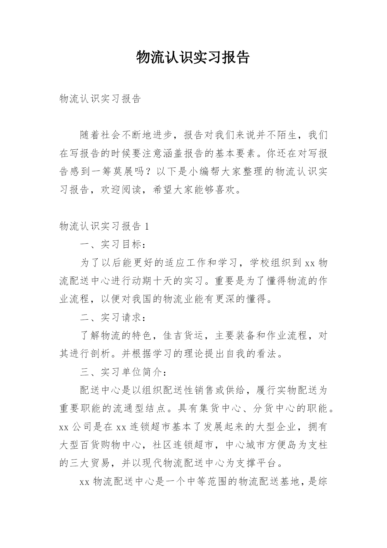 物流认识实习报告物流认识实习报告随着社会不断地进步,报告对我们来说并不陌生,我们在写报告的时候要注意涵盖报告的基本要素。你还在对写报告感到一筹莫展吗?以下是小编帮大家整理的物流认识实习报告,欢迎阅读,希望大家能够喜欢。物流认识实习报告1一、实习目标:为了以后能更好的适应工作和学习,学校组织到xx物流配送中心进行动期十天的实习。重要是为了懂得物流的作业流程,以便对我国的物流业能有更深的懂得。二、实习请求:了解物流的特色,佳吉货运,主要装备和作业流程,对其进行剖析。并根据学习的理论提出自我的看法。三、实习单位
