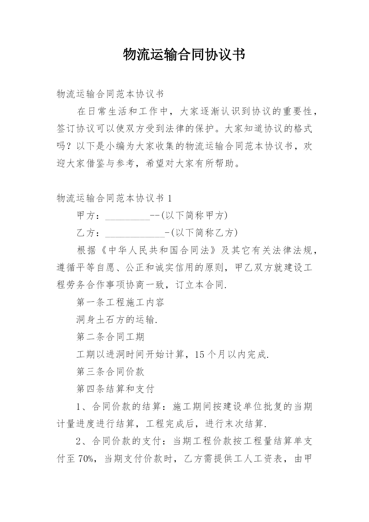 物流运输合同协议书物流运输合同范本协议书在日常生活和工作中,大家逐渐认识到协议的重要性,签订协议可以使双方受到法律的保护。大家知道协议的格式吗?以下是小编为大家收集的物流运输合同范本协议书,欢迎大家借鉴与参考,希望对大家有所帮助。物流运输合同范本协议书1甲方:_________--(以下简称甲方)乙方:____________-(以下简称乙方)根据《中华人民共和国合同法》及其它有关法律法规,遵循平等自愿、公正和诚实信用的原则,甲乙双方就建设工程劳务合作事项协商一致,订立本合同.第一条工程施工内容洞身土石方
