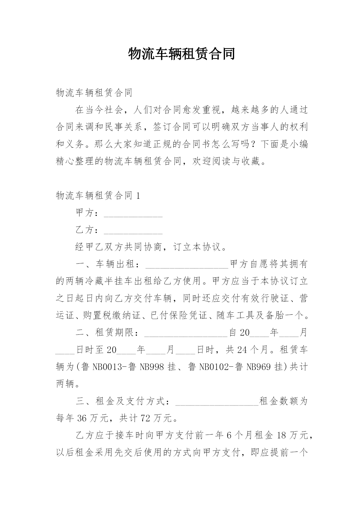 物流车辆租赁合同物流车辆租赁合同在当今社会,人们对合同愈发重视,越来越多的人通过合同来调和民事关系,签订合同可以明确双方当事人的权利和义务。那么大家知道正规的合同书怎么写吗?下面是小编精心整理的物流车辆租赁合同,欢迎阅读与收藏。物流车辆租赁合同1甲方:____________乙方:____________经甲乙双方共同协商,订立本协议。一、车辆出租:_________________甲方自愿将其拥有的两辆冷藏半挂车出租给乙方使用。甲方应当于本协议订立之日起日内向乙方交付车辆,同时还应交付有效行驶证、营运证