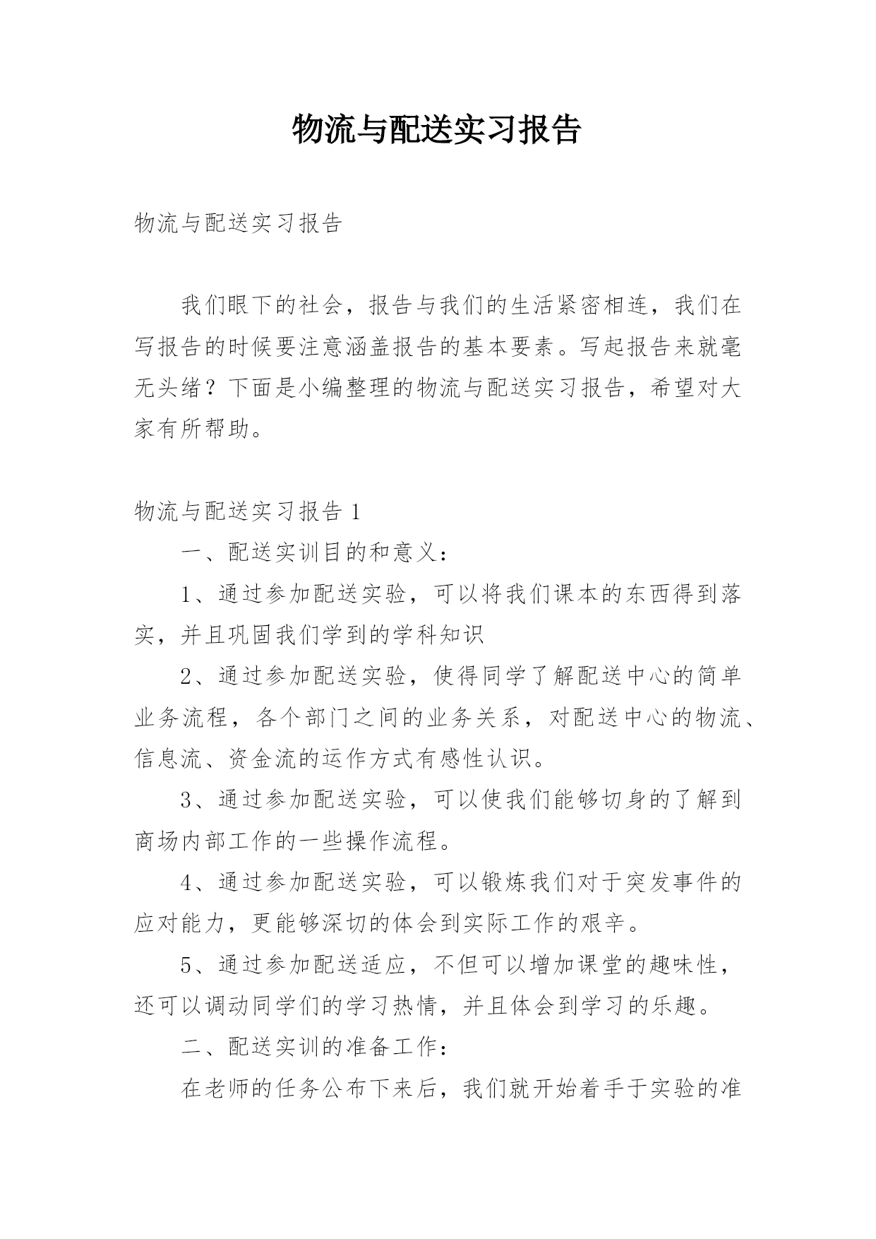 物流与配送实习报告物流与配送实习报告我们眼下的社会,报告与我们的生活紧密相连,我们在写报告的时候要注意涵盖报告的基本要素。写起报告来就毫无头绪?下面是小编整理的物流与配送实习报告,希望对大家有所帮助。物流与配送实习报告1一、配送实训目的和意义:1、通过参加配送实验,可以将我们课本的东西得到落实,并且巩固我们学到的学科知识2、通过参加配送实验,使得同学了解配送中心的简单业务流程,各个部门之间的业务关系,对配送中心的物流、信息流、资金流的运作方式有感性认识。3、通过参加配送实验,可以使我们能够切身的了解到商场