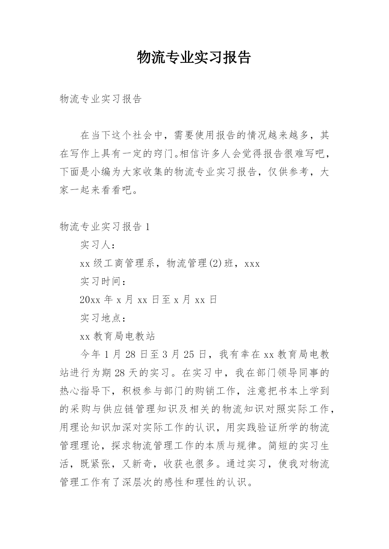 物流专业实习报告物流专业实习报告在当下这个社会中,需要使用报告的情况越来越多,其在写作上具有一定的窍门。相信许多人会觉得报告很难写吧,下面是小编为大家收集的物流专业实习报告,仅供参考,大家一起来看看吧。物流专业实习报告1实习人:xx级工商管理系,物流管理(2)班,xxx实习时间:20xx年x月xx日至x月xx日实习地点:xx教育局电教站今年1月28日至3月25日,我有幸在xx教育局电教站进行为期28天的实习。在实习中,我在部门领导同事的热心指导下,积极参与部门的购销工作,注意把书本上学到的采购与供应链管理