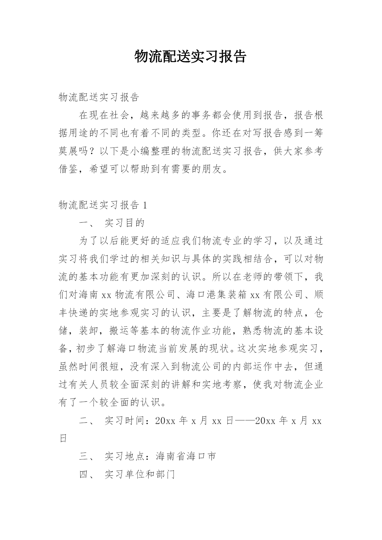 物流配送实习报告物流配送实习报告在现在社会,越来越多的事务都会使用到报告,报告根据用途的不同也有着不同的类型。你还在对写报告感到一筹莫展吗?以下是小编整理的物流配送实习报告,供大家参考借鉴,希望可以帮助到有需要的朋友。物流配送实习报告1一、实习目的为了以后能更好的适应我们物流专业的学习,以及通过实习将我们学过的相关知识与具体的实践相结合,可以对物流的基本功能有更加深刻的认识。所以在老师的带领下,我们对海南xx物流有限公司、海口港集装箱xx有限公司、顺丰快递的实地参观实习的认识,主要是了解物流的特点,仓储,