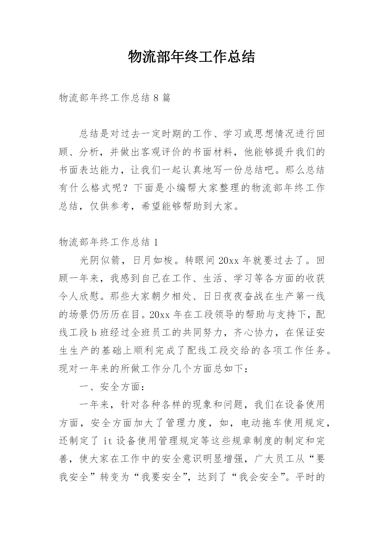 物流部年终工作总结物流部年终工作总结8篇总结是对过去一定时期的工作、学习或思想情况进行回顾、分析,并做出客观评价的书面材料,他能够提升我们的书面表达能力,让我们一起认真地写一份总结吧。那么总结有什么格式呢?下面是小编帮大家整理的物流部年终工作总结,仅供参考,希望能够帮助到大家。物流部年终工作总结1光阴似箭,日月如梭。转眼间20xx年就要过去了。回顾一年来,我感到自己在工作、生活、学习等各方面的收获令人欣慰。那些大家朝夕相处、日日夜夜奋战在生产第一线的场景仍历历在目。20xx年在工段领导的帮助与支持下,配线