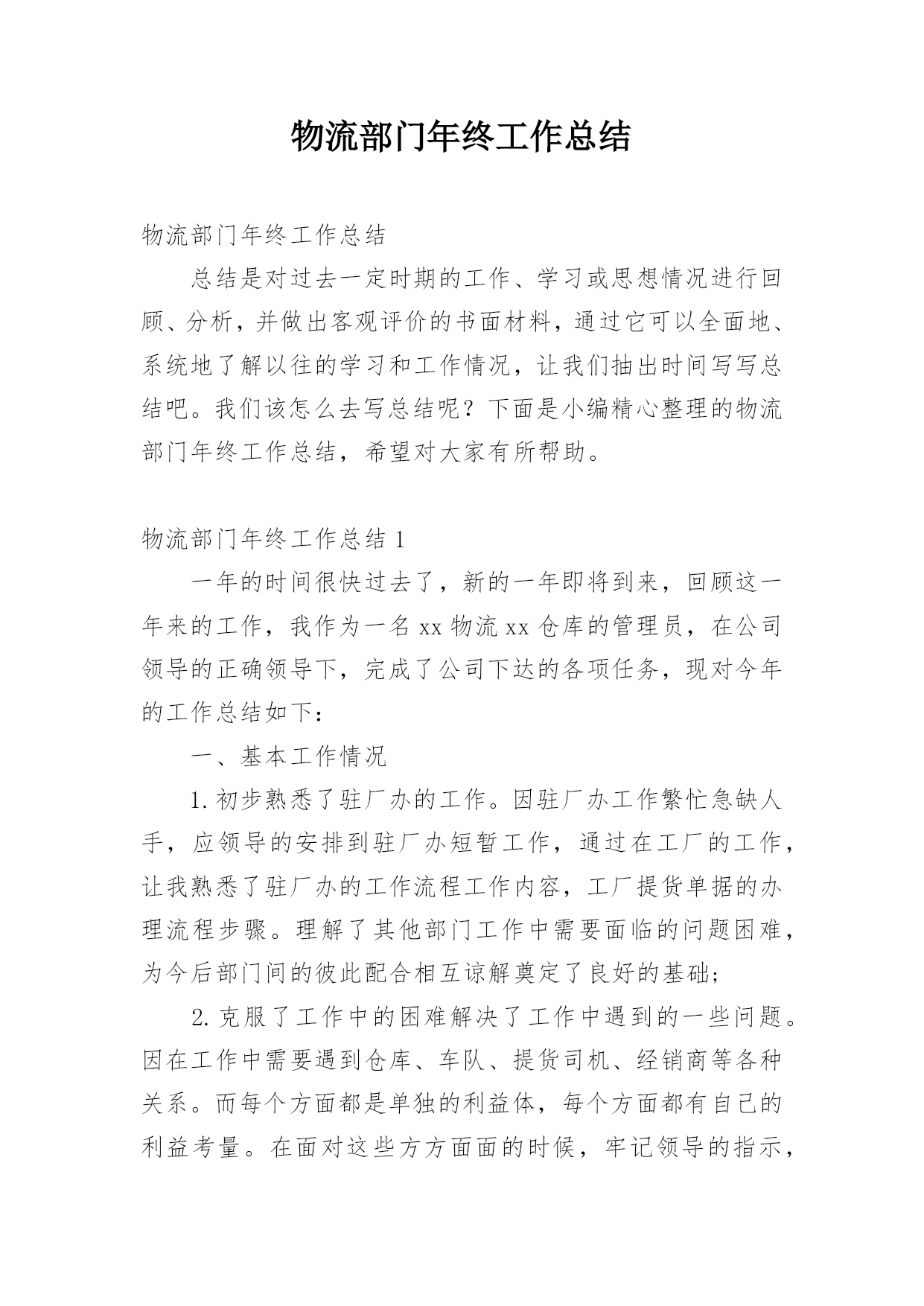物流部门年终工作总结物流部门年终工作总结总结是对过去一定时期的工作、学习或思想情况进行回顾、分析,并做出客观评价的书面材料,通过它可以全面地、系统地了解以往的学习和工作情况,让我们抽出时间写写总结吧。我们该怎么去写总结呢?下面是小编精心整理的物流部门年终工作总结,希望对大家有所帮助。物流部门年终工作总结1一年的时间很快过去了,新的一年即将到来,回顾这一年来的工作,我作为一名xx物流xx仓库的管理员,在公司领导的正确领导下,完成了公司下达的各项任务,现对今年的工作总结如下:一、基本工作情况1.初步熟悉了驻厂