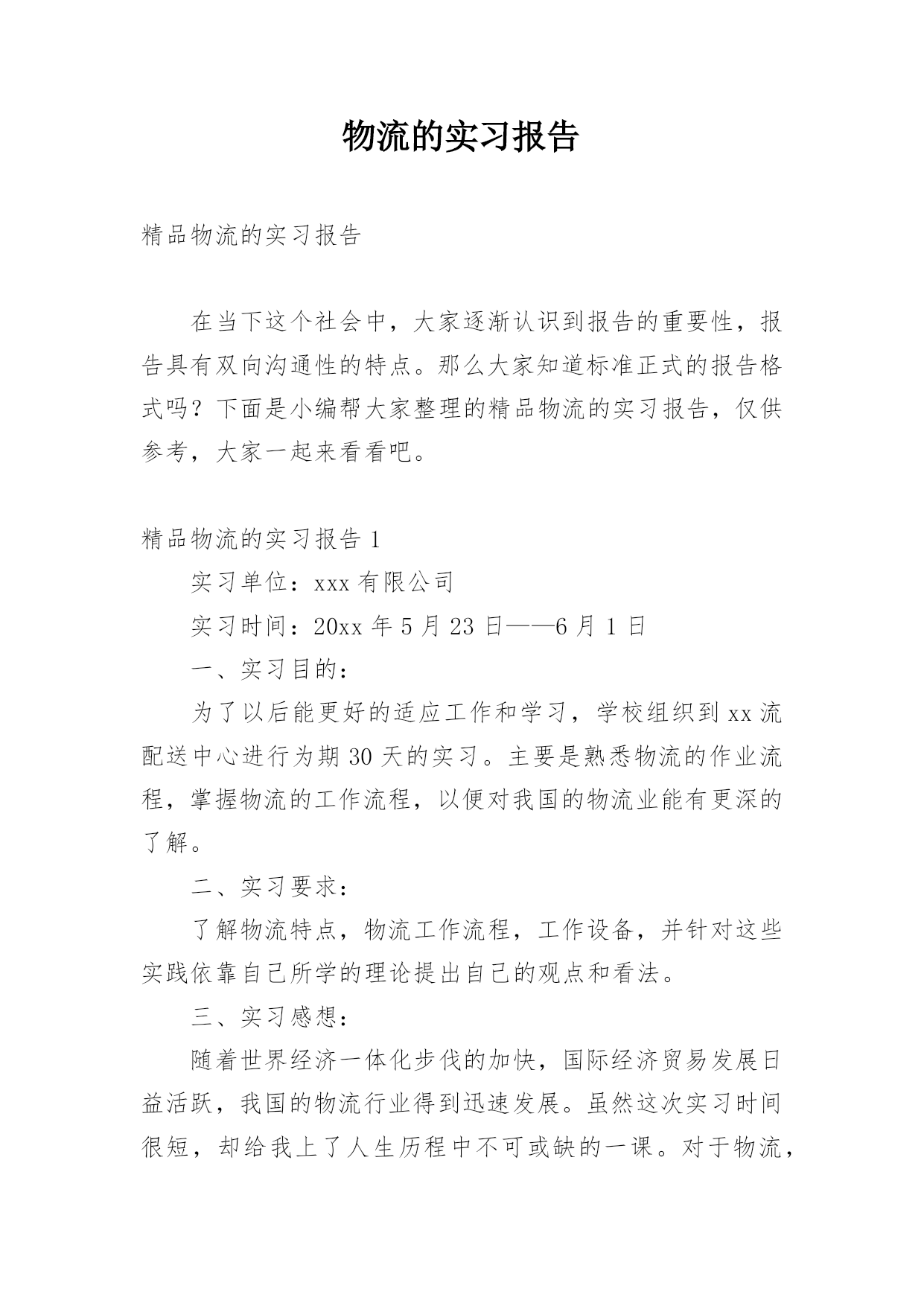 物流的实习报告精品物流的实习报告在当下这个社会中,大家逐渐认识到报告的重要性,报告具有双向沟通性的特点。那么大家知道标准正式的报告格式吗?下面是小编帮大家整理的精品物流的实习报告,仅供参考,大家一起来看看吧。精品物流的实习报告1实习单位:xxx有限公司实习时间:20xx年5月23日——6月1日一、实习目的:为了以后能更好的适应工作和学习,学校组织到xx流配送中心进行为期30天的实习。主要是熟悉物流的作业流程,掌握物流的工作流程,以便对我国的物流业能有更深的了解。二、实习要求:了解物流特点,物流工作流程,工