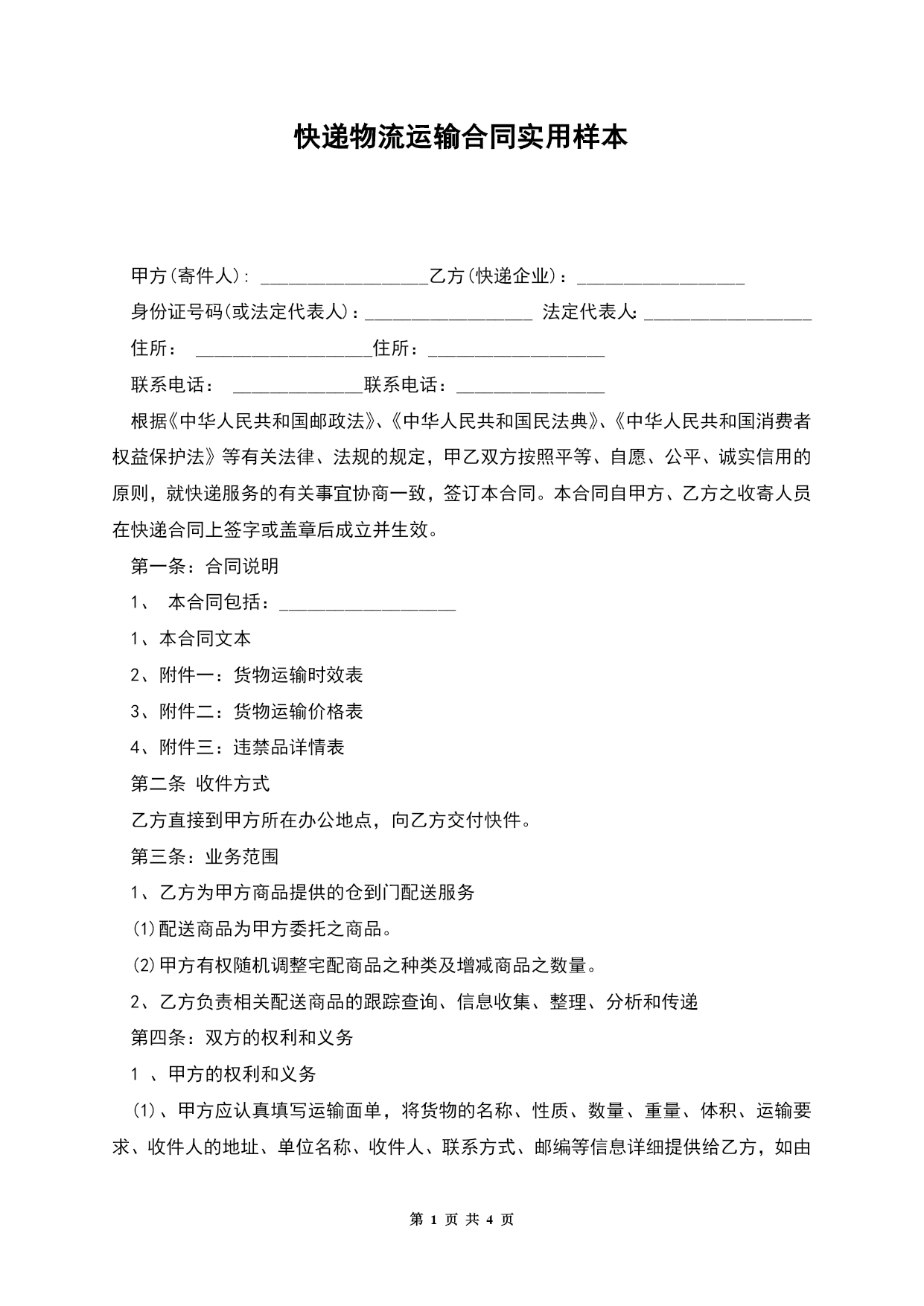 第PAGE\*MERGEFORMAT4页共NUMPAGES\*MERGEFORMAT4页快递物流运输合同实用样本甲方(寄件人):__________________乙方(快递企业):__________________身份证号码(或法定代表人):__________________法定代表人:__________________住所:___________________住所:___________________联系电话:______________联系电话:________________