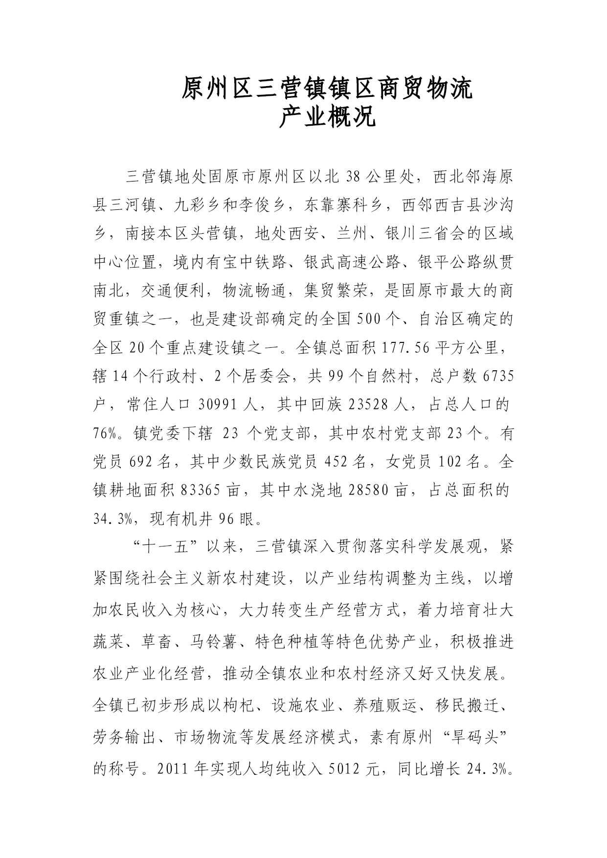 原州区三营镇镇区商贸物流产业概况三营镇地处固原市原州区以北38公里处,西北邻海原县三河镇、九彩乡和李俊乡,东靠寨科乡,西邻西吉县沙沟乡,南接本区头营镇,地处西安、兰州、银川三省会的区域中心位置,境内有宝中铁路、银武高速公路、银平公路纵贯南北,交通便利,物流畅通,集贸繁荣,是固原市最大的商贸重镇之一,也是建设部确定的全国500个、自治区确定的全区20个重点建设镇之一。全镇总面积177.56平方公里,辖14个行政村、2个居委会,共99个自然村,总户数6735户,常住人口30991人,其中回族23528人,占总
