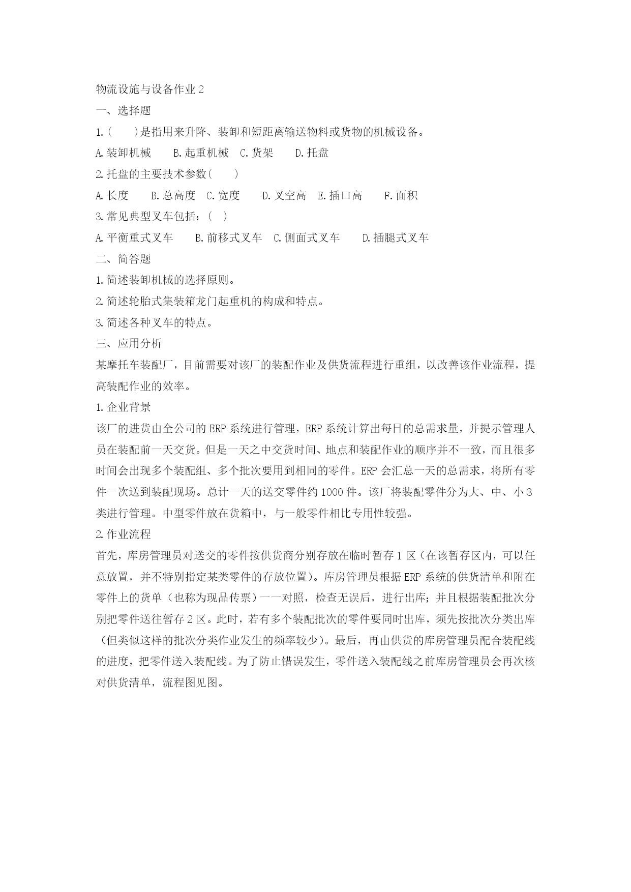 物流设施与设备作业2一、选择题1.()是指用来升降、装卸和短距离输送物料或货物的机械设备。A.装卸机械B.起重机械C.货架D.托盘2.托盘的主要技术参数()A.长度B.总高度C.宽度D.叉空高E.插口高F.面积3.常见典型叉车包括:()A.平衡重式叉车B.前移式叉车C.侧面式叉车D.插腿式叉车二、简答题1.简述装卸机械的选择原则。2.简述轮胎式集装箱龙门起重机的构成和特点。3.简述各种叉车的特点。三、应用分析某摩托车装配厂,目前需要对该厂的装配作业及供货流程进行重组,以改善该作业流程,提高装配作业的效率。