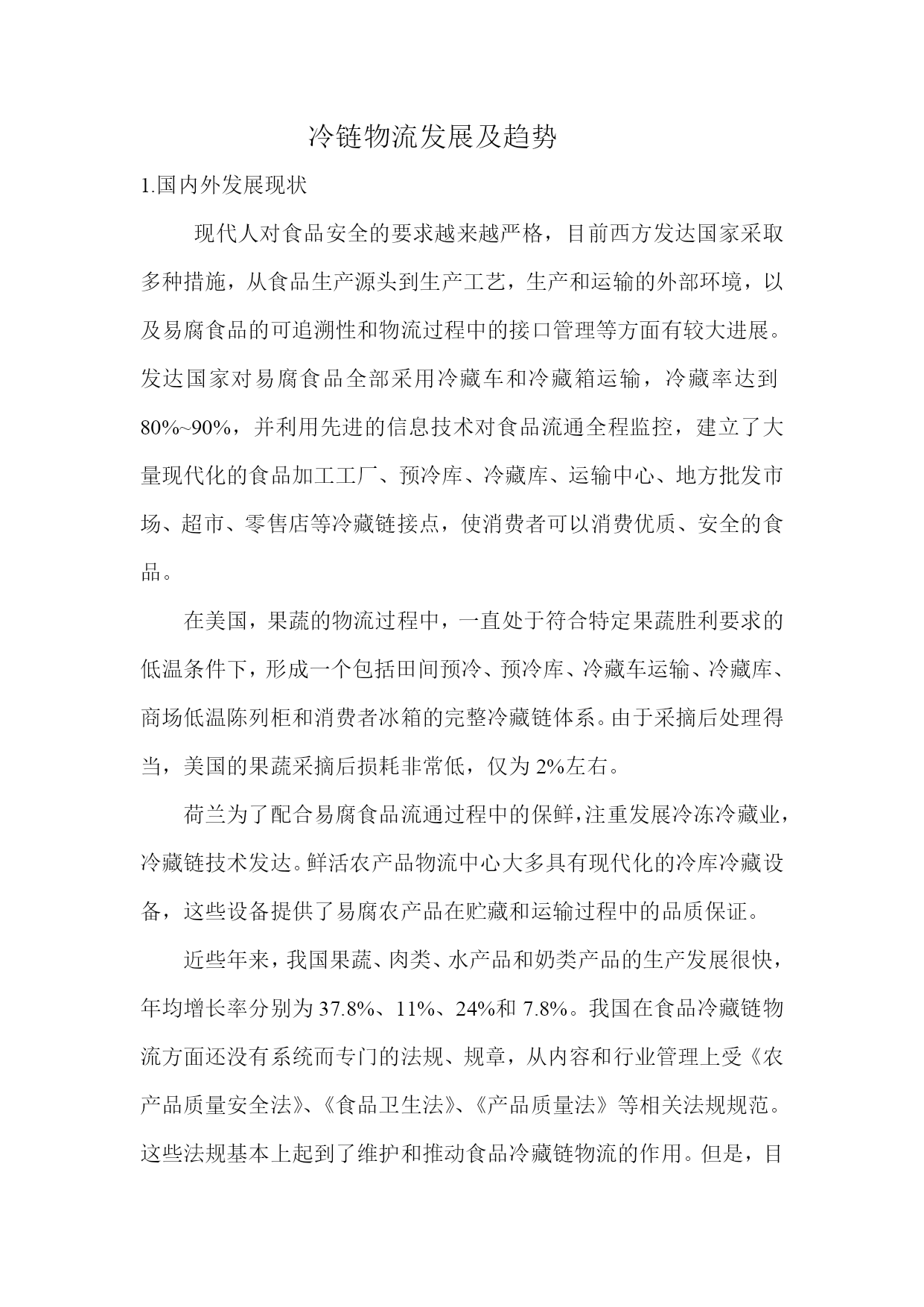 冷链物流发展及趋势国内外发展现状现代人对食品安全的要求越来越严格,目前西方发达国家采取多种措施,从食品生产源头到生产工艺,生产和运输的外部环境,以及易腐食品的可追溯性和物流过程中的接口管理等方面有较大进展。发达国家对易腐食品全部采用冷藏车和冷藏箱运输,冷藏率达到80%~90%,并利用先进的信息技术对食品流通全程监控,建立了大量现代化的食品加工工厂、预冷库、冷藏库、运输中心、地方批发市场、超市、零售店等冷藏链接点,使消费者可以消费优质、安全的食品。在美国,果蔬的物流过程中,一直处于符合特定果蔬胜利要求的低温