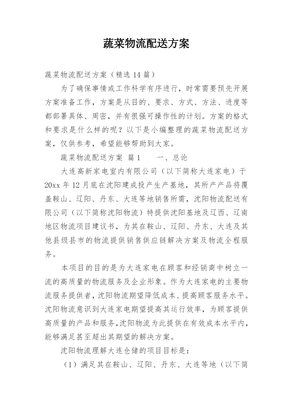 蔬菜物流配送方案蔬菜物流配送方案(精选14篇)为了确保事情或工作科学有序进行,时常需要预先开展方案准备工作,方案是从目的、要求、方式、方法、进度等都部署具体、周密,并有很强可操作性的计划。方案的格式和要求是什么样的呢?以下是小编整理的蔬菜物流配送方案,仅供参考,希望能够帮助到大家。蔬菜物流配送方案篇1一、总论大连高新家电室内有限公司(以下简称大连家电)于20xx年12月底在沈阳建成投产生产基地,其所产产品将覆盖鞍山、辽阳、丹东、大连等地销售所需,沈阳物流配送有限公司(以下简称沈阳物流)特提供沈阳基地及辽西
