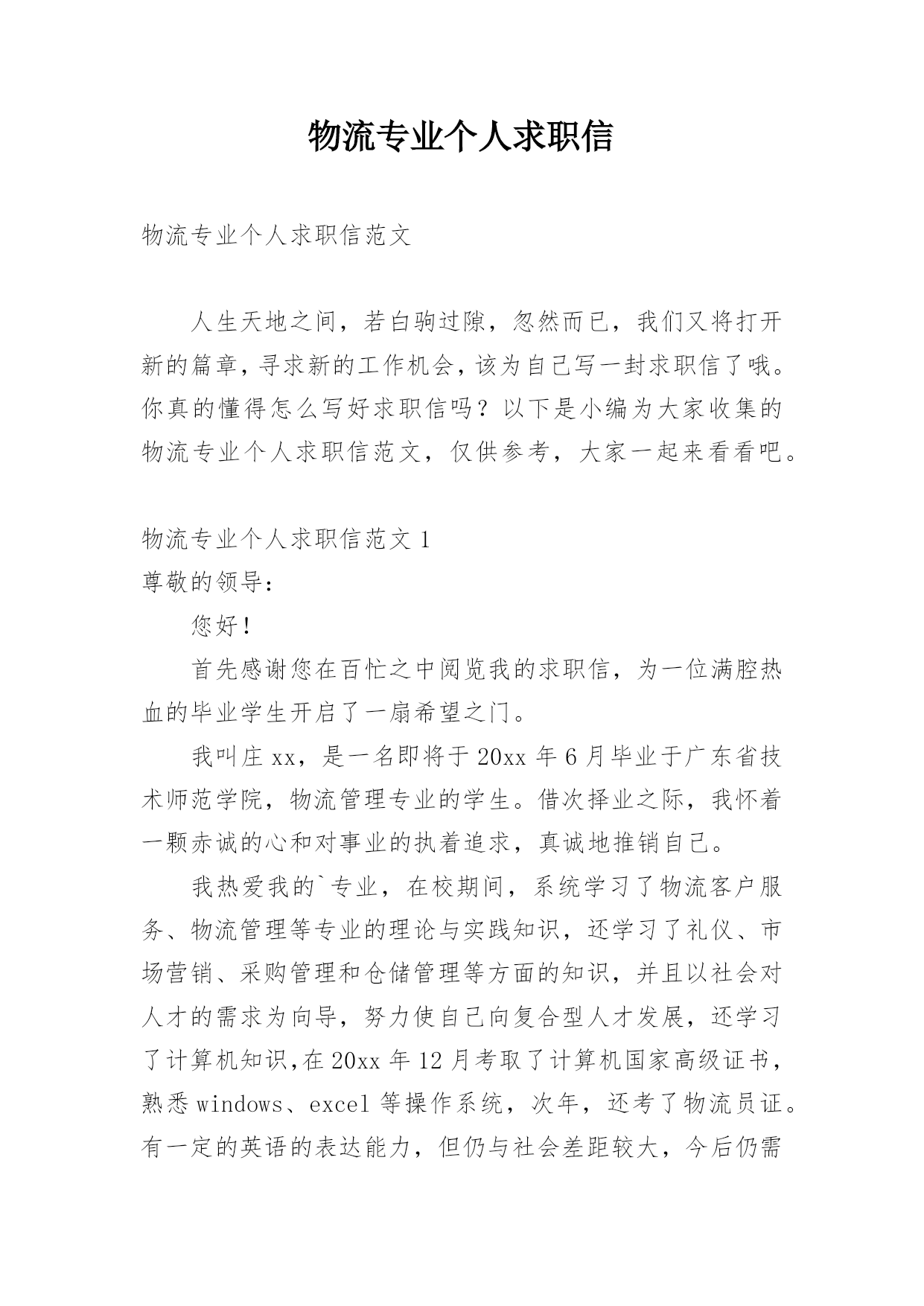 物流专业个人求职信物流专业个人求职信范文人生天地之间,若白驹过隙,忽然而已,我们又将打开新的篇章,寻求新的工作机会,该为自己写一封求职信了哦。你真的懂得怎么写好求职信吗?以下是小编为大家收集的物流专业个人求职信范文,仅供参考,大家一起来看看吧。物流专业个人求职信范文1尊敬的领导:您好!首先感谢您在百忙之中阅览我的求职信,为一位满腔热血的毕业学生开启了一扇希望之门。我叫庄xx,是一名即将于20xx年6月毕业于广东省技术师范学院,物流管理专业的学生。借次择业之际,我怀着一颗赤诚的心和对事业的执着追求,真诚地推