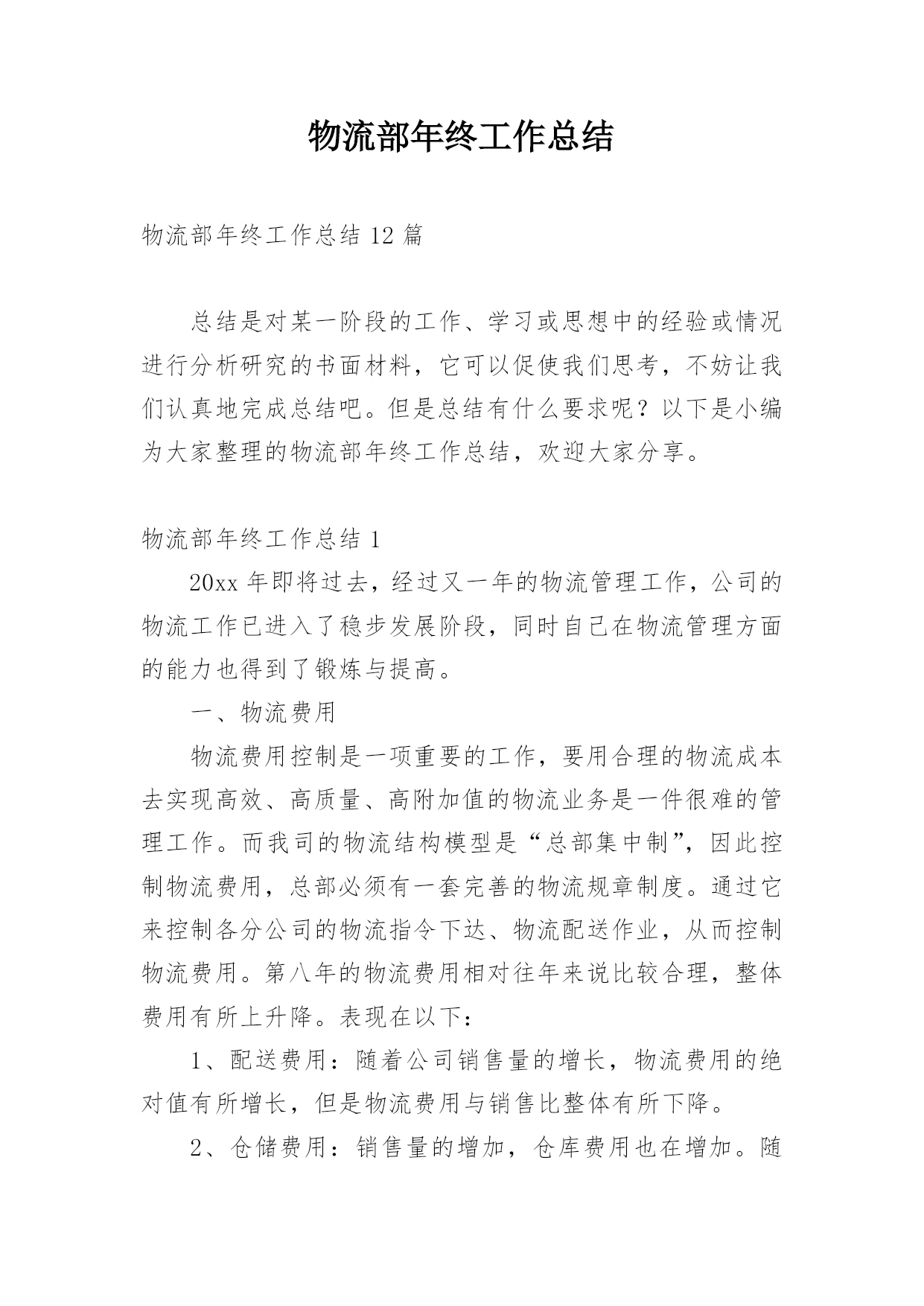 物流部年终工作总结物流部年终工作总结12篇总结是对某一阶段的工作、学习或思想中的经验或情况进行分析研究的书面材料,它可以促使我们思考,不妨让我们认真地完成总结吧。但是总结有什么要求呢?以下是小编为大家整理的物流部年终工作总结,欢迎大家分享。物流部年终工作总结120xx年即将过去,经过又一年的物流管理工作,公司的物流工作已进入了稳步发展阶段,同时自己在物流管理方面的能力也得到了锻炼与提高。一、物流费用物流费用控制是一项重要的工作,要用合理的物流成本去实现高效、高质量、高附加值的物流业务是一件很难的管理工作。