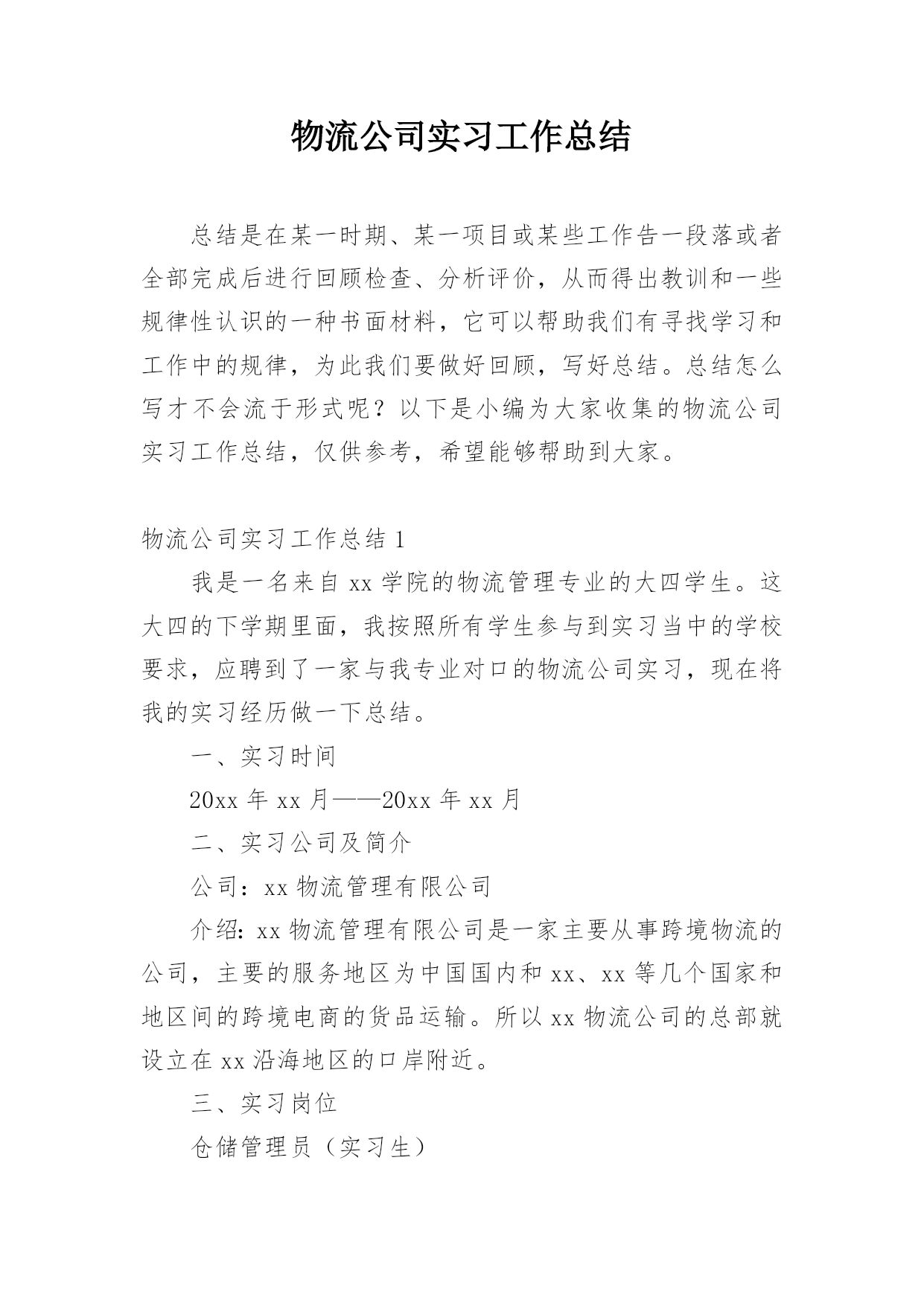 物流公司实习工作总结总结是在某一时期、某一项目或某些工作告一段落或者全部完成后进行回顾检查、分析评价,从而得出教训和一些规律性认识的一种书面材料,它可以帮助我们有寻找学习和工作中的规律,为此我们要做好回顾,写好总结。总结怎么写才不会流于形式呢?以下是小编为大家收集的物流公司实习工作总结,仅供参考,希望能够帮助到大家。物流公司实习工作总结1我是一名来自xx学院的物流管理专业的大四学生。这大四的下学期里面,我按照所有学生参与到实习当中的学校要求,应聘到了一家与我专业对口的物流公司实习,现在将我的实习经历做一下