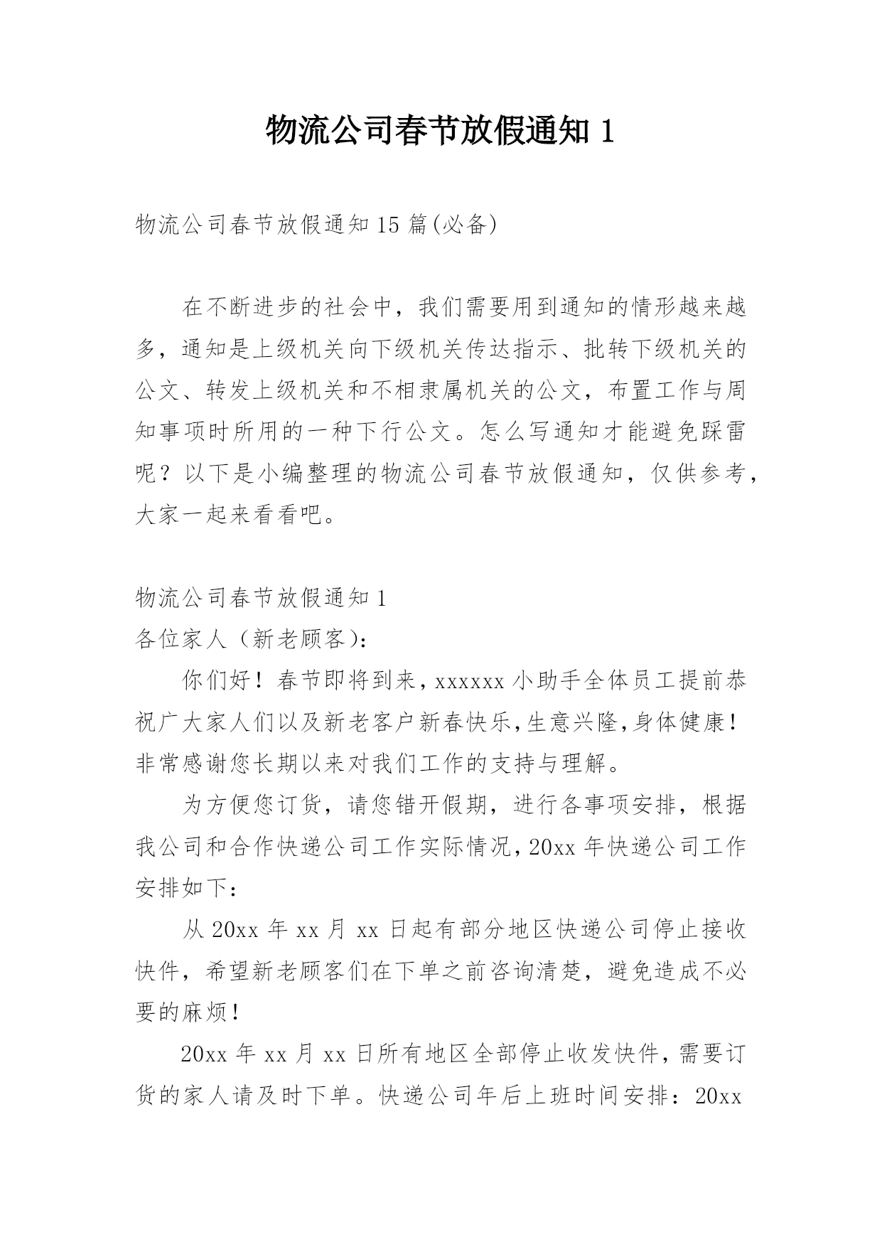 物流公司春节放假通知1物流公司春节放假通知15篇(必备)在不断进步的社会中,我们需要用到通知的情形越来越多,通知是上级机关向下级机关传达指示、批转下级机关的公文、转发上级机关和不相隶属机关的公文,布置工作与周知事项时所用的一种下行公文。怎么写通知才能避免踩雷呢?以下是小编整理的物流公司春节放假通知,仅供参考,大家一起来看看吧。物流公司春节放假通知1各位家人(新老顾客):你们好!春节即将到来,xxxxxx小助手全体员工提前恭祝广大家人们以及新老客户新春快乐,生意兴隆,身体健康!非常感谢您长期以来对我们工作的