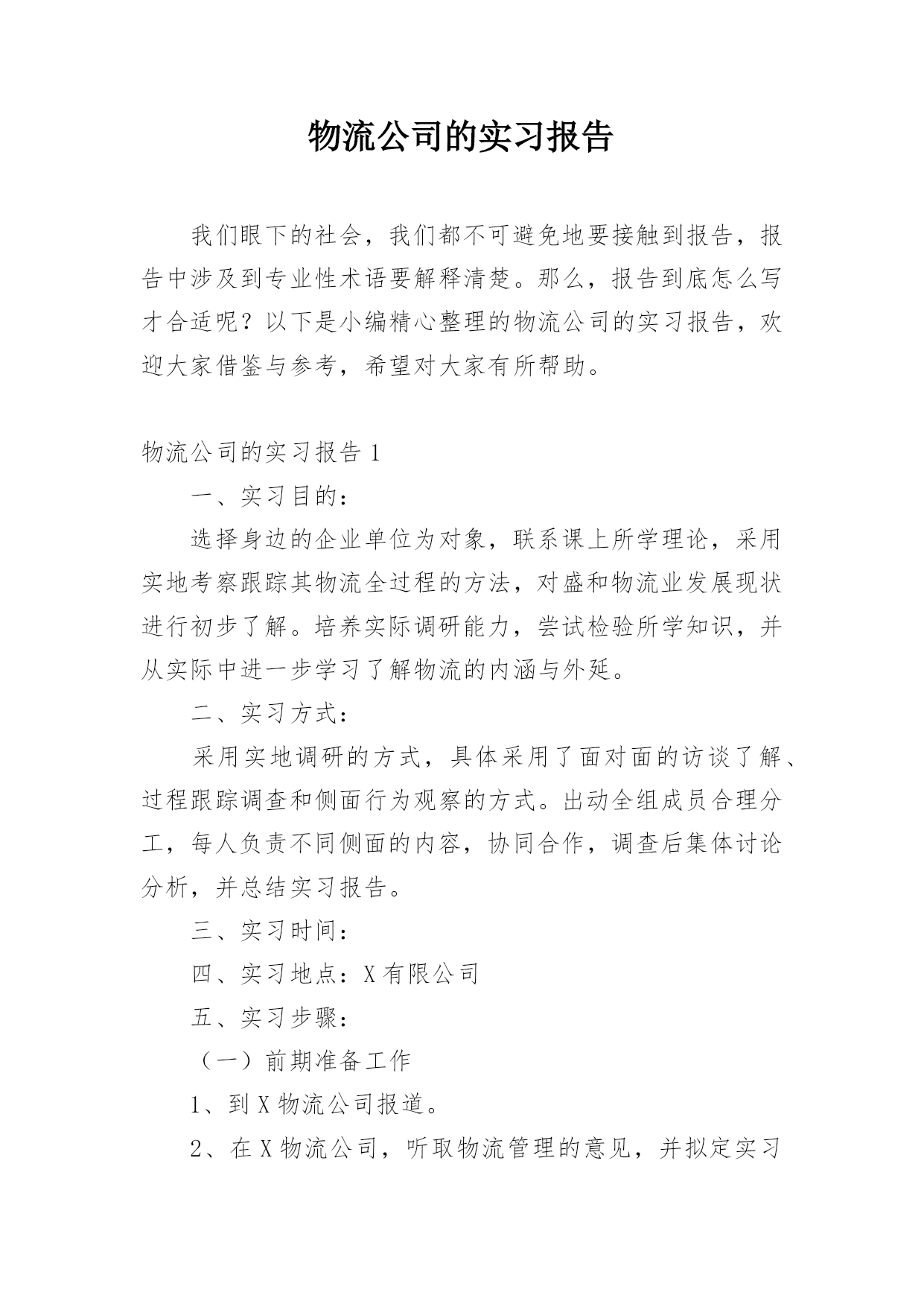 物流公司的实习报告我们眼下的社会,我们都不可避免地要接触到报告,报告中涉及到专业性术语要解释清楚。那么,报告到底怎么写才合适呢?以下是小编精心整理的物流公司的实习报告,欢迎大家借鉴与参考,希望对大家有所帮助。物流公司的实习报告1一、实习目的:选择身边的企业单位为对象,联系课上所学理论,采用实地考察跟踪其物流全过程的方法,对盛和物流业发展现状进行初步了解。培养实际调研能力,尝试检验所学知识,并从实际中进一步学习了解物流的内涵与外延。二、实习方式:采用实地调研的方式,具体采用了面对面的访谈了解、过程跟踪调查和