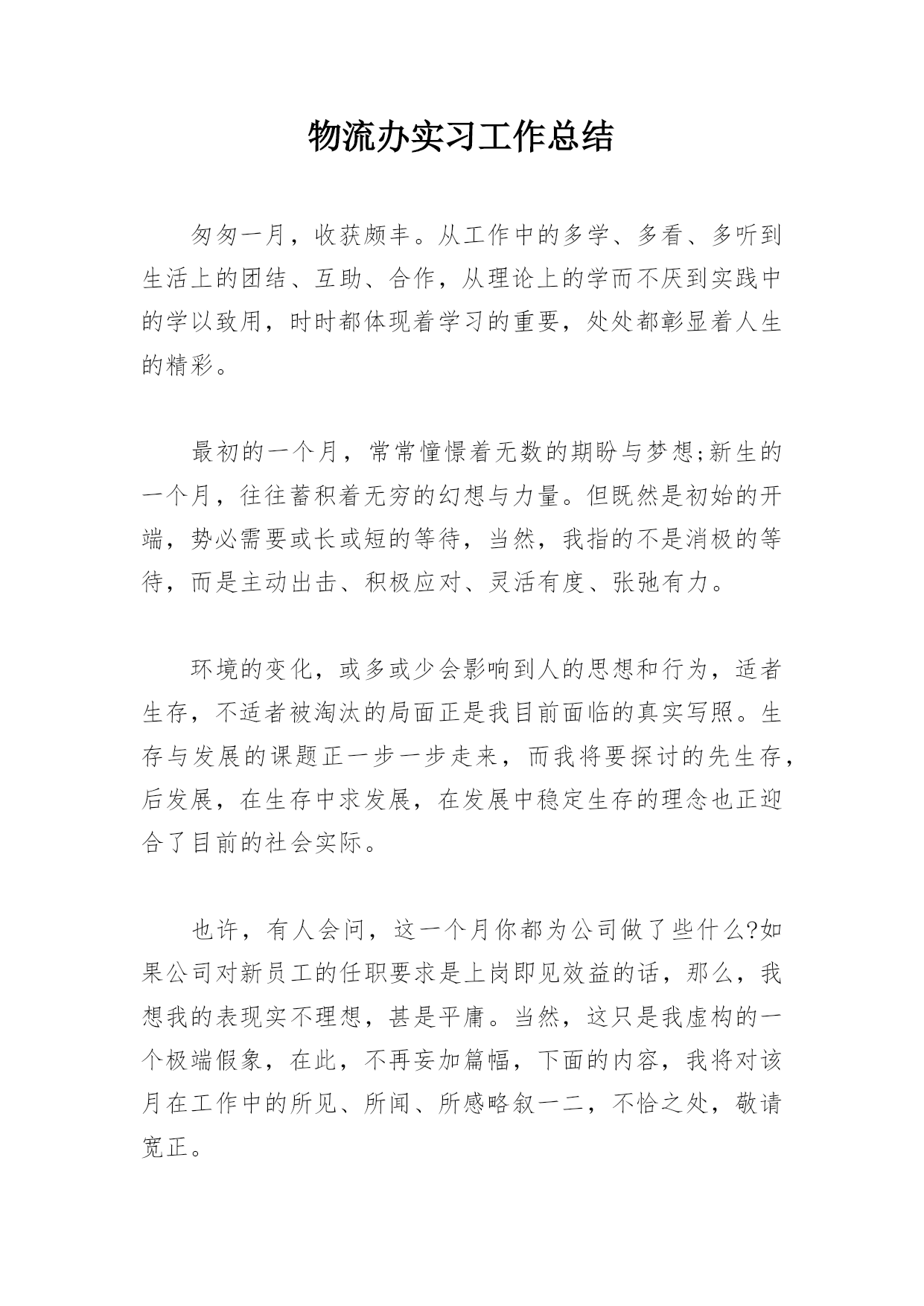 物流办实习工作总结匆匆一月,收获颇丰。从工作中的多学、多看、多听到生活上的团结、互助、合作,从理论上的学而不厌到实践中的学以致用,时时都体现着学习的重要,处处都彰显着人生的精彩。最初的一个月,常常憧憬着无数的期盼与梦想;新生的一个月,往往蓄积着无穷的幻想与力量。但既然是初始的开端,势必需要或长或短的等待,当然,我指的不是消极的等待,而是主动出击、积极应对、灵活有度、张弛有力。环境的变化,或多或少会影响到人的思想和行为,适者生存,不适者被淘汰的局面正是我目前面临的真实写照。生存与发展的课题正一步一步走来,而
