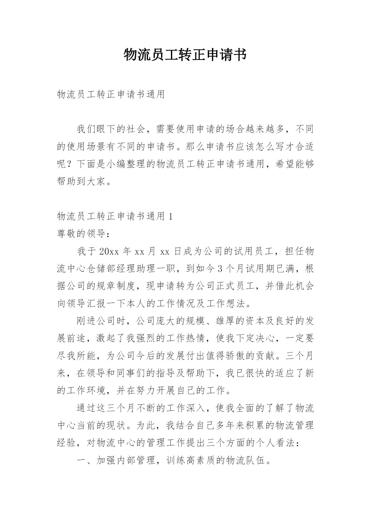 物流员工转正申请书物流员工转正申请书通用我们眼下的社会,需要使用申请的场合越来越多,不同的使用场景有不同的申请书。那么申请书应该怎么写才合适呢?下面是小编整理的物流员工转正申请书通用,希望能够帮助到大家。物流员工转正申请书通用1尊敬的领导:我于20xx年xx月xx日成为公司的试用员工,担任物流中心仓储部经理助理一职,到如今3个月试用期已满,根据公司的规章制度,现申请转为公司正式员工,并借此机会向领导汇报一下本人的工作情况及工作想法。刚进公司时,公司庞大的规模、雄厚的资本及良好的发展前途,激起了我强烈的工作