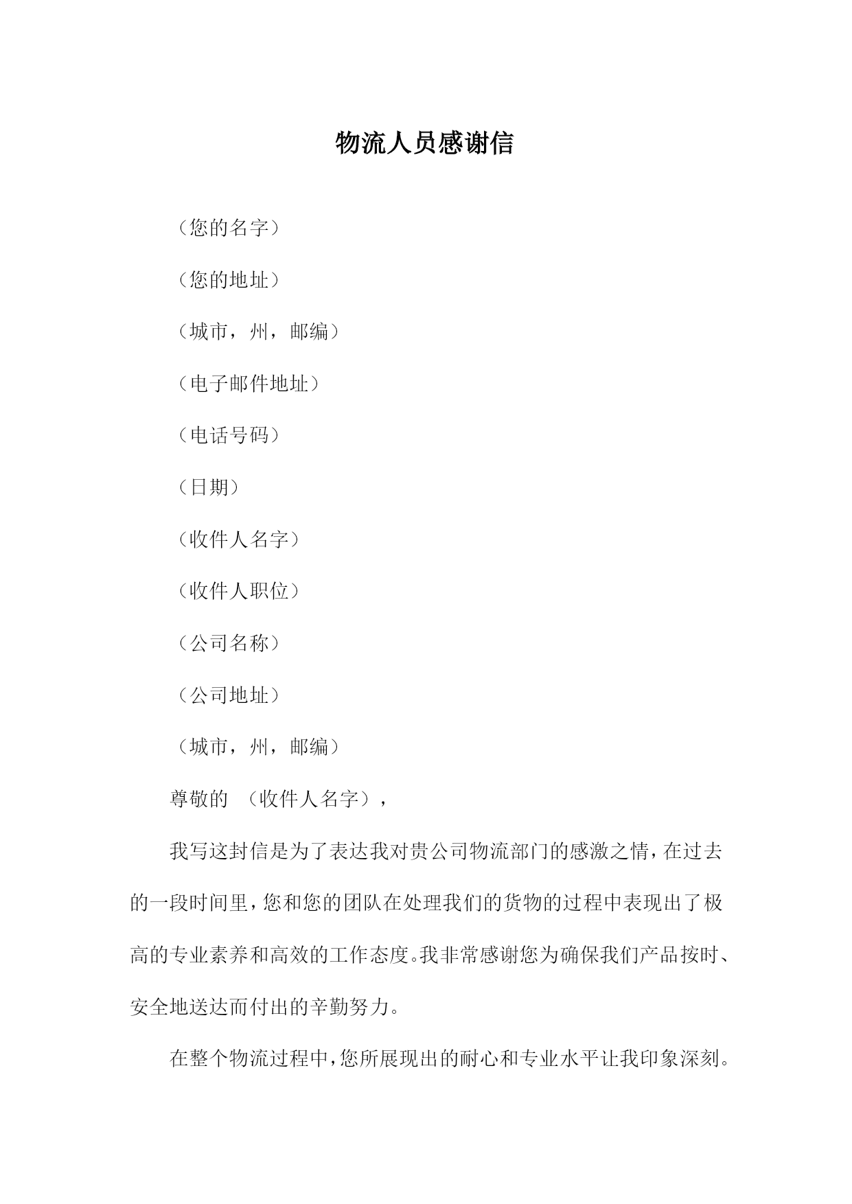 物流人员感谢信(您的名字)(您的地址)(城市,州,邮编)(电子邮件地址)(电话号码)(日期)(收件人名字)(收件人职位)(公司名称)(公司地址)(城市,州,邮编)尊敬的(收件人名字),我写这封信是为了表达我对贵公司物流部门的感激之情,在过去的一段时间里,您和您的团队在处理我们的货物的过程中表现出了极高的专业素养和高效的工作态度。我非常感谢您为确保我们产品按时、安全地送达而付出的辛勤努力。在整个物流过程中,您所展现出的耐心和专业水平让我印象深刻。您始终确保我们的货物在最短的时间内到达目的地,并在整个过程中保