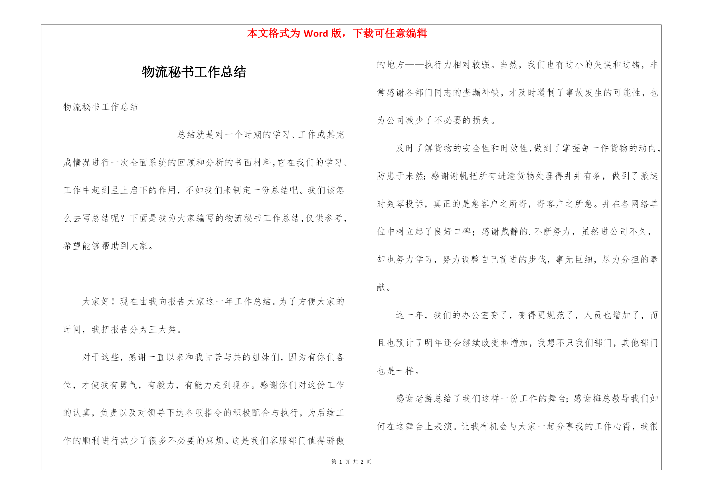 本文格式为Word版,下载可任意编辑第PAGE\*MERGEFORMAT2页共NUMPAGES\*MERGEFORMAT2页物流秘书工作总结物流秘书工作总结总结就是对一个时期的学习、工作或其完成情况进行一次全面系统的回顾和分析的书面材料,它在我们的学习、工作中起到呈上启下的作用,不如我们来制定一份总结吧。我们该怎么去写总结呢?下面是我为大家编写的物流秘书工作总结,仅供参考,希望能够帮助到大家。大家好!现在由我向报告大家这一年工作总结。为了方便大家的时间,我把报告分为三大类。对于这些,感谢一直以