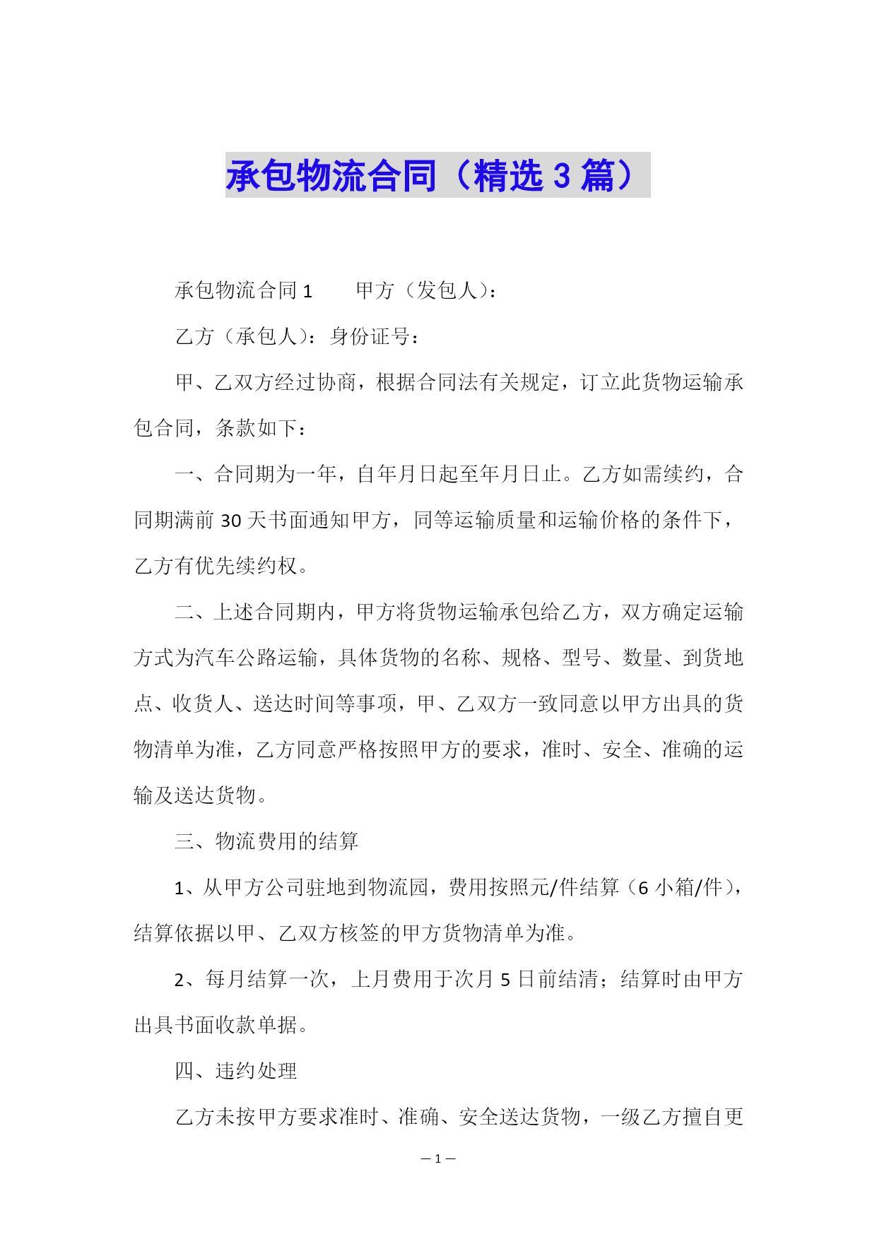 —PAGE\*MERGEFORMAT12—承包物流合同(精选3篇)承包物流合同1甲方(发包人):乙方(承包人):身份证号:甲、乙双方经过协商,根据合同法有关规定,订立此货物运输承包合同,条款如下:一、合同期为一年,自年月日起至年月日止。乙方如需续约,合同期满前30天书面通知甲方,同等运输质量和运输价格的条件下,乙方有优先续约权。二、上述合同期内,甲方将货物运输承包给乙方,双方确定运输方式为汽车公路运输,具体货物的名称、规格、型号、数量、到货地点、收货人、送达时间等事项,甲、乙双方一致同意以甲方出具的